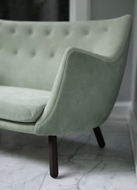 The small two-seater sofa was inspired by modern art and is characterized by exceptional comfort, traditional craftsmanship and materials of the highest quality. At the Cabinetmakers’ Guild Exhibition in 1941 the Poet was showcased next to two plaster sculptures by the artist Sigurjón Ólafsson. With the approach of an artist, Finn Juhl designed the sofa’s organic shape and managed to forge the relation between furniture and sculpture.
