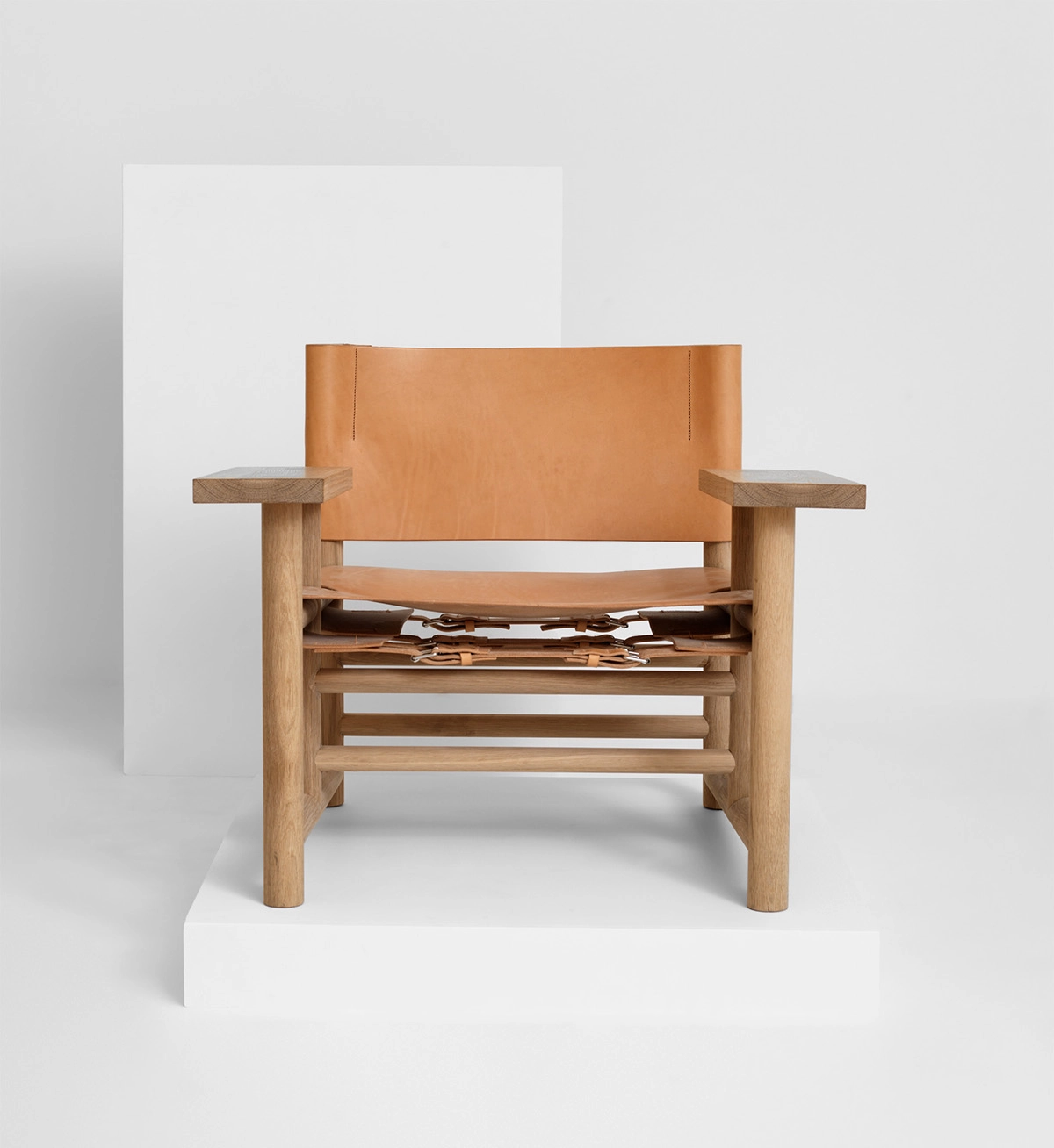 Armchair, design Joacim Wahlström. Made exclusively of solid Swedish oak. Seat and back in 5 mm thick, self-supporting, ecologically tanned leather. The seat and back are replaceable and can be tightened gradually. Integrated furniture pads made of ecologically tanned, Swedish leather. Can be purchased untreated or treated with natural linseed oil.