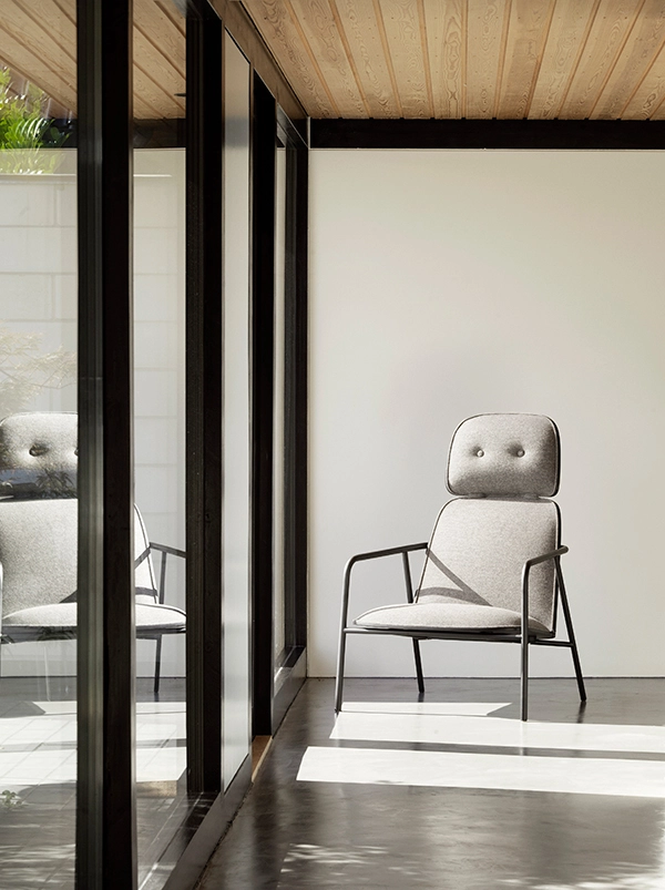 The Pad series is characterized by its distinct combination of materials, tactility and shape. The molded shells in oak veneer stand in contrast to the soft, padded front, while the metal base adds airiness and strength to the design.