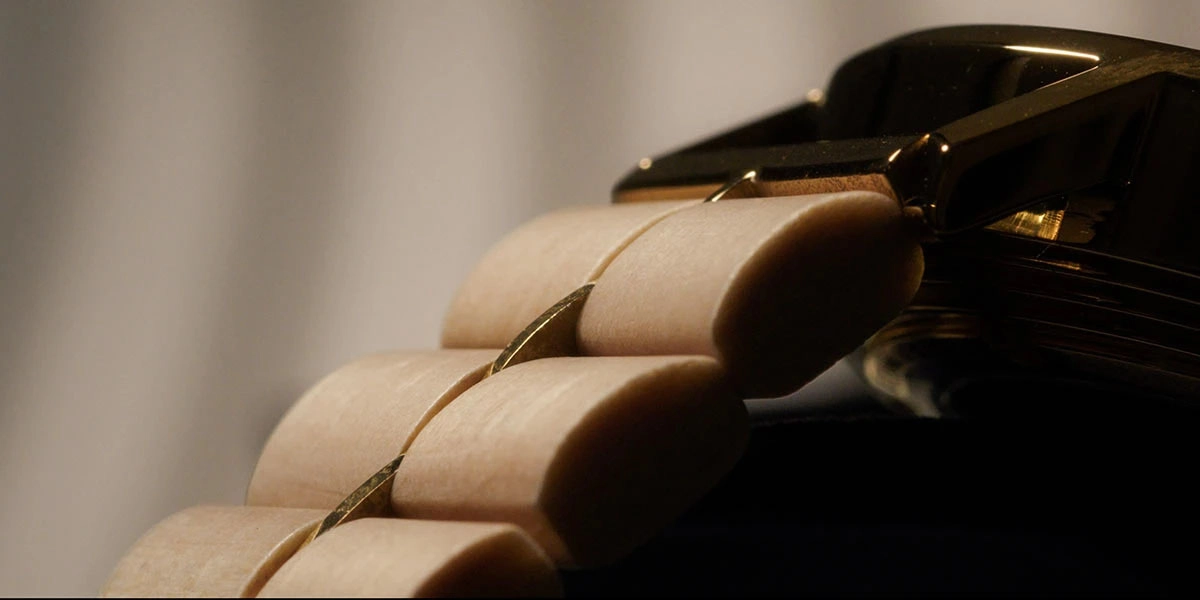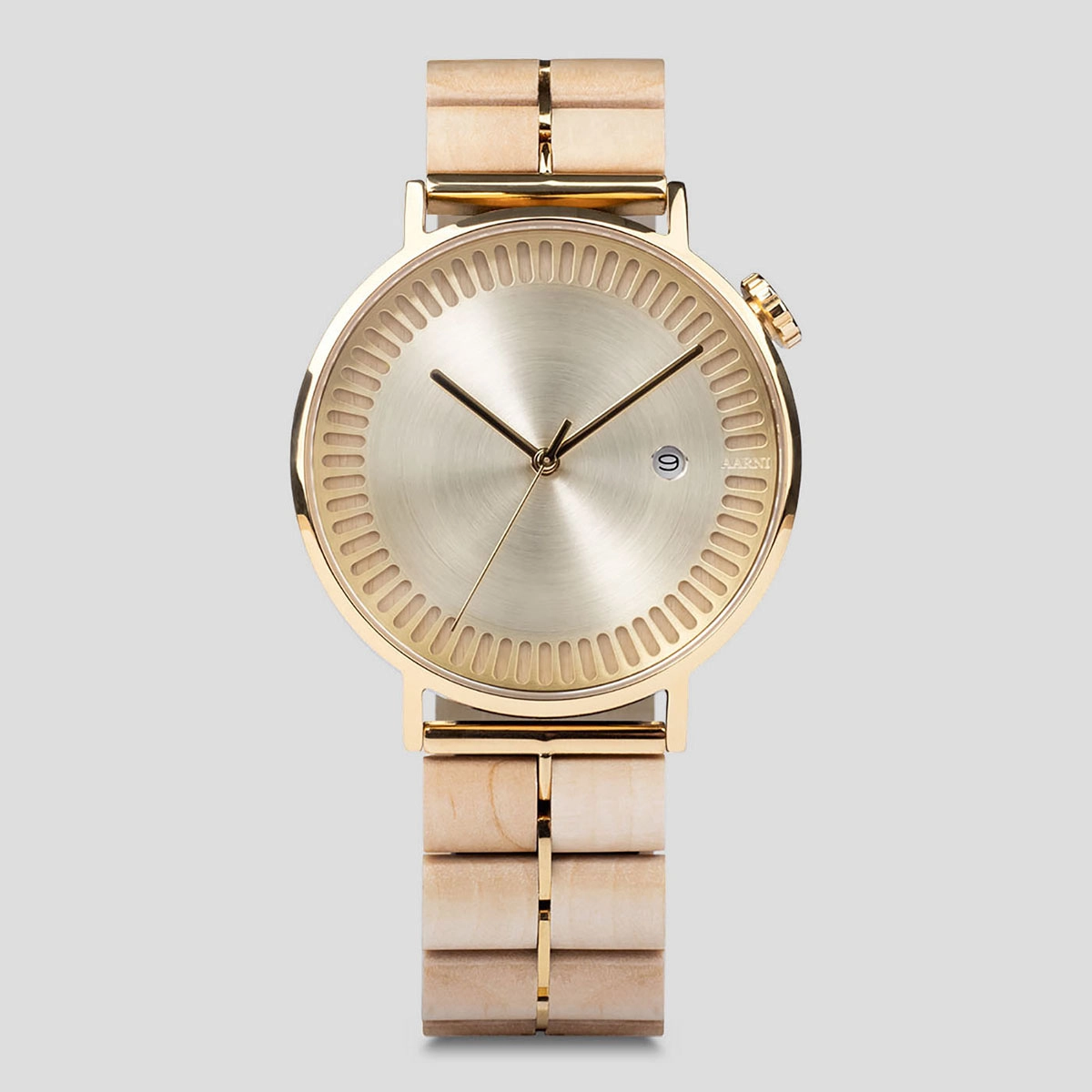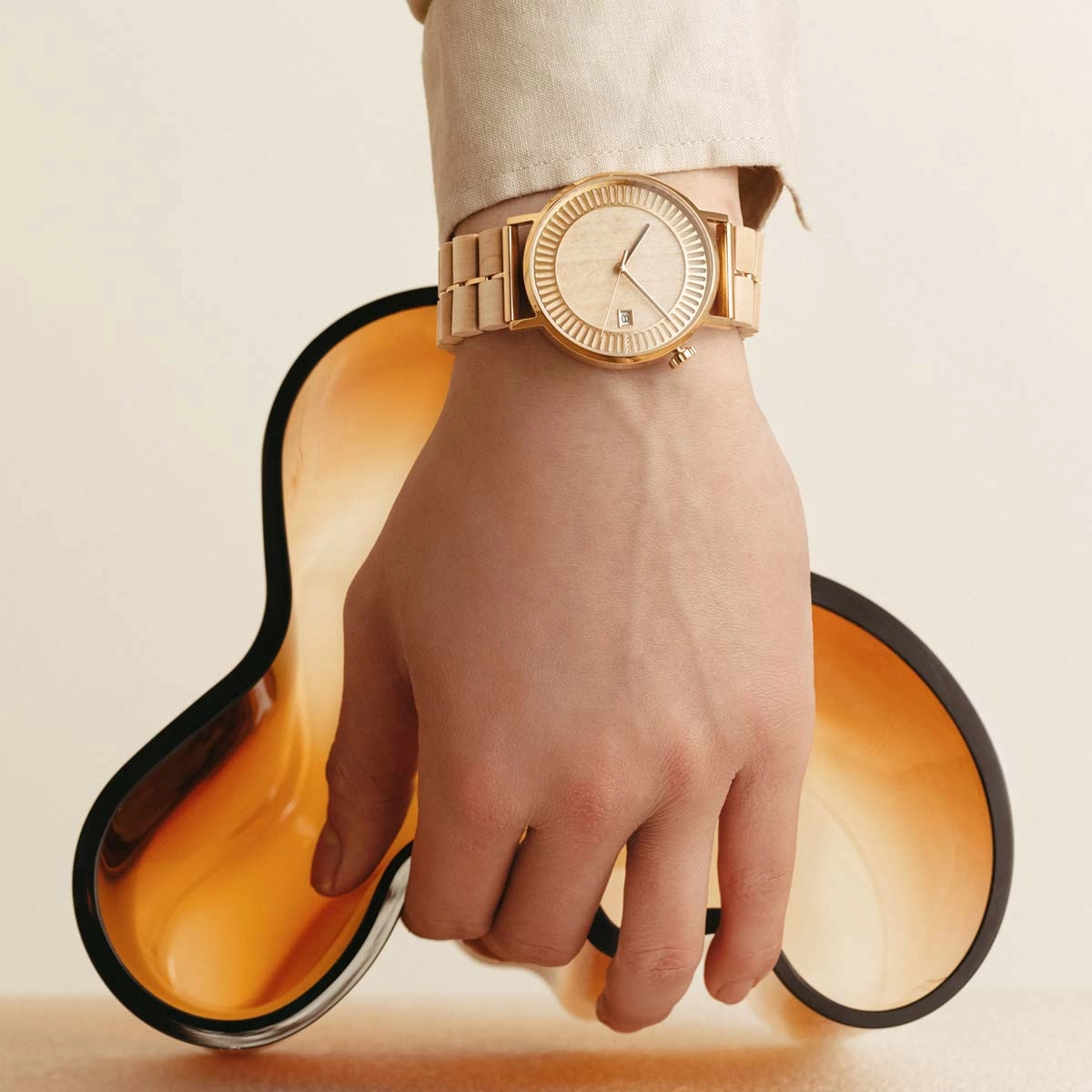 In the watch collection, the gold-toned case and the bezel structure with circular holes are combined with harmonious birch wood.