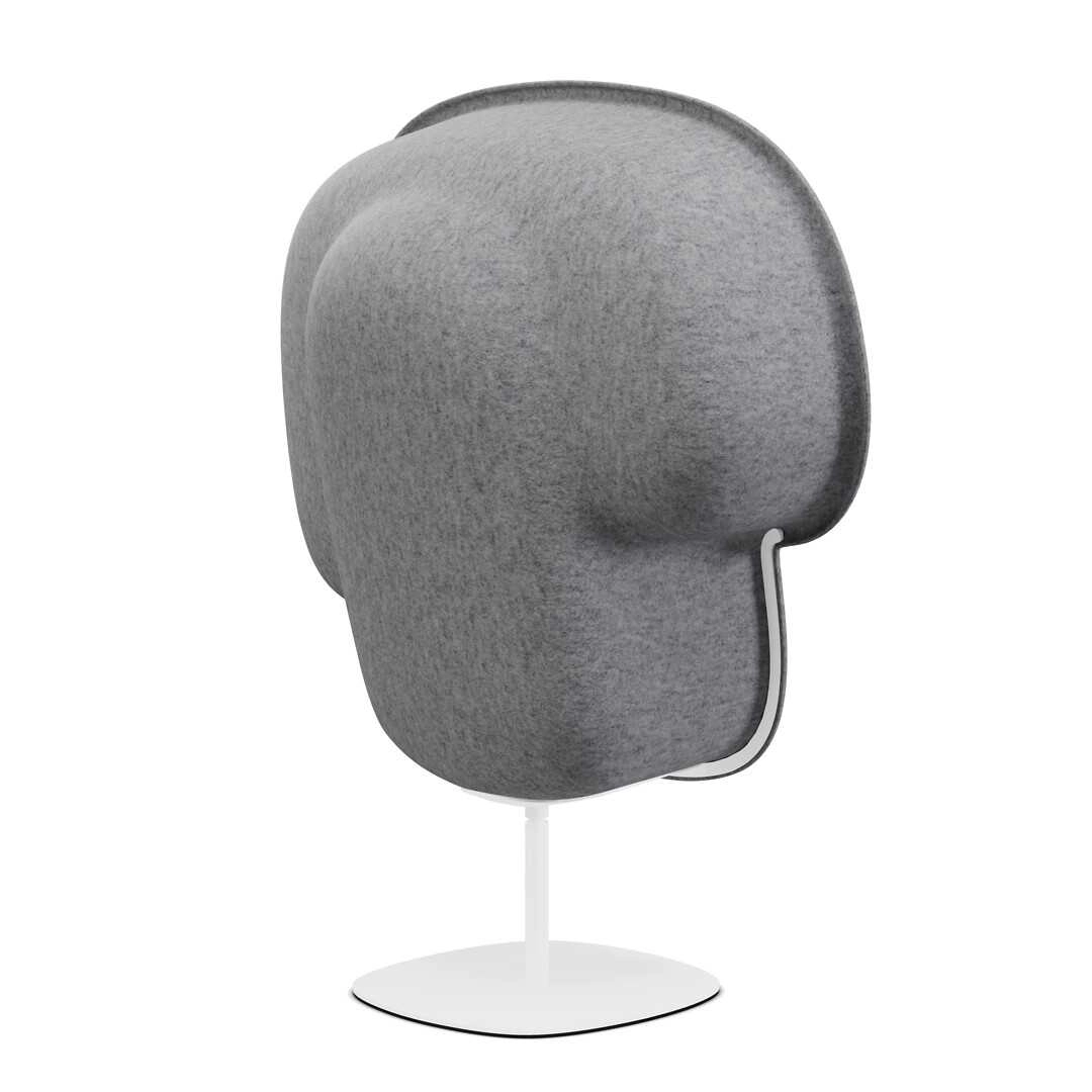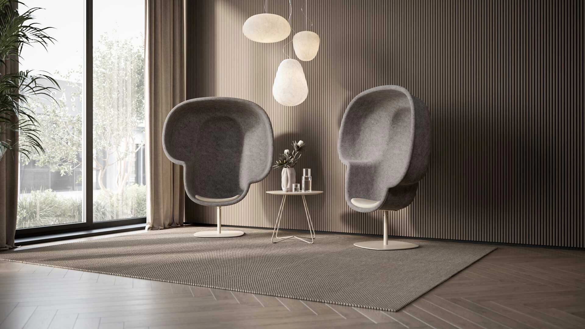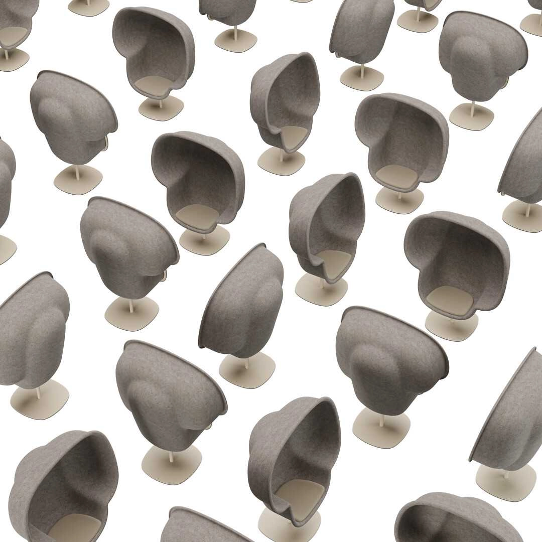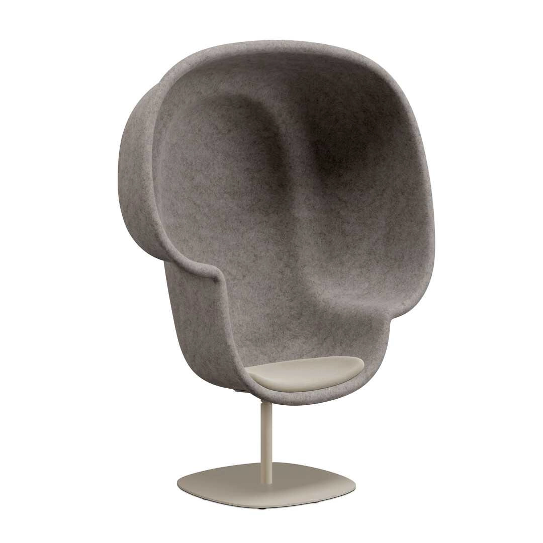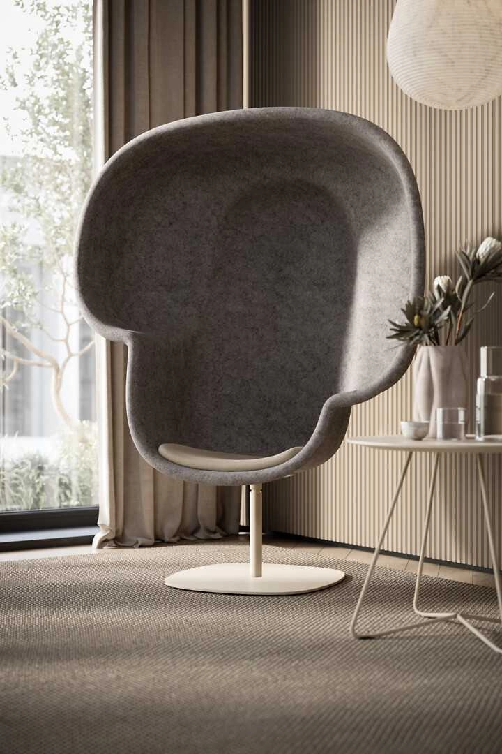 One of the main features of the Hubbe chair, which is sustainably made from compressed felt, is the privacy it offers, the level of which the user can easily adjust by choosing the desired seating direction at any given time thanks to the rotating base.
