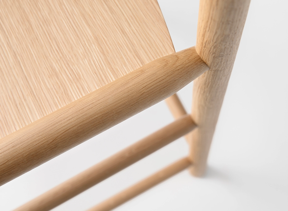 “The intention of the Akademia Bar Chair was to make bar-height seating that is as comfortable as a dining chair. The relatively high backrest and ample seat width ensures that even a full meal can be enjoyed at the bar. As with the Akademia chair, minimal, vertical lines are complemented by the thin curved plywood of the seat and backrest. Available with leather or textile upholstery for additional comfort.”