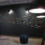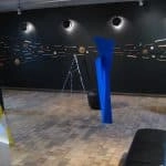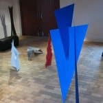 Amalie’s installation art utilizes the large room using suspended textiles and a theme of bent metal plate in spatial triangles – painted with 50 coats of color.