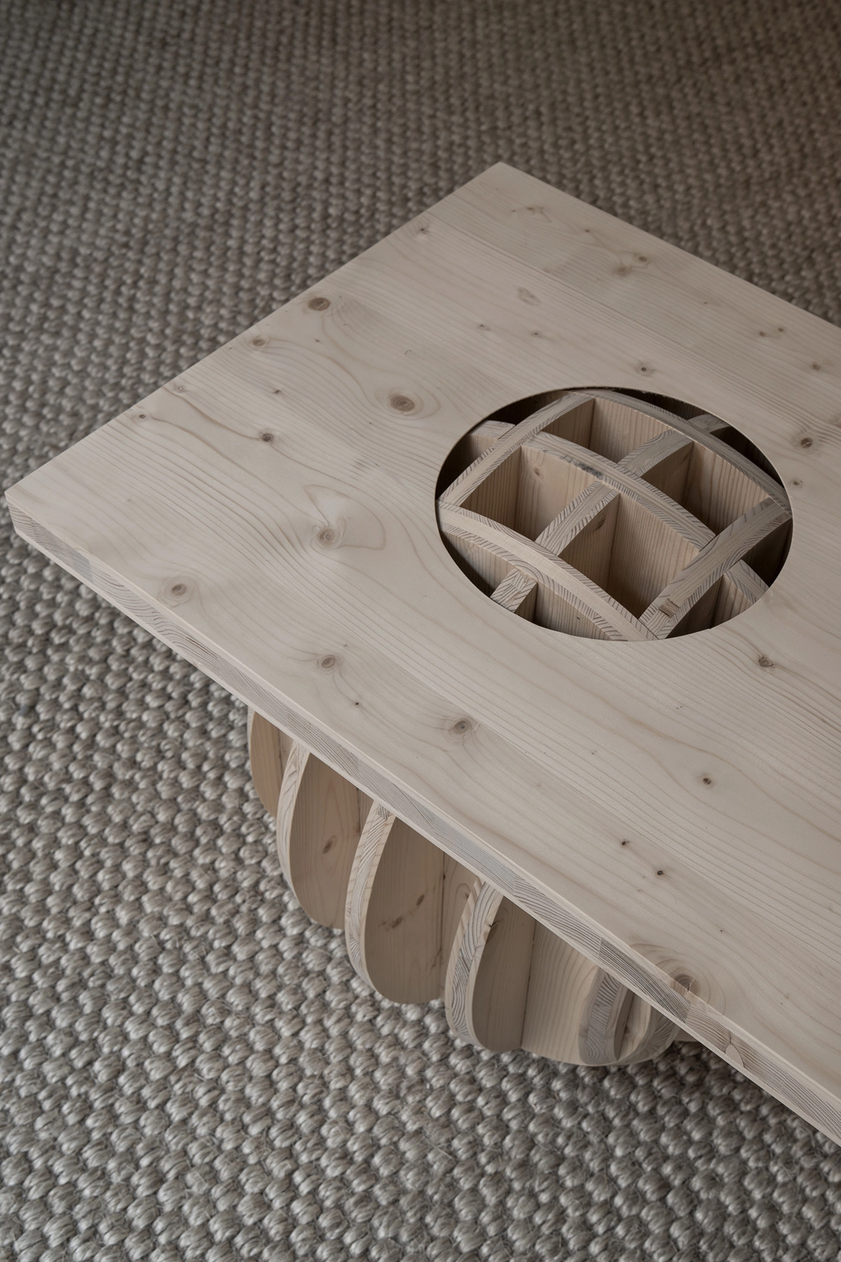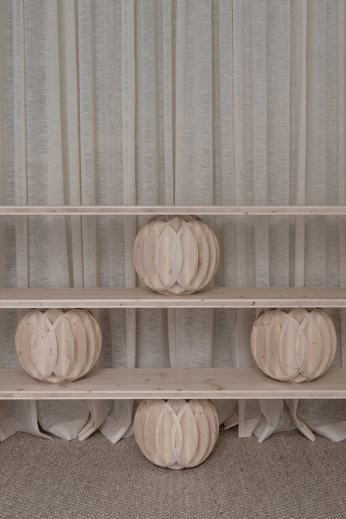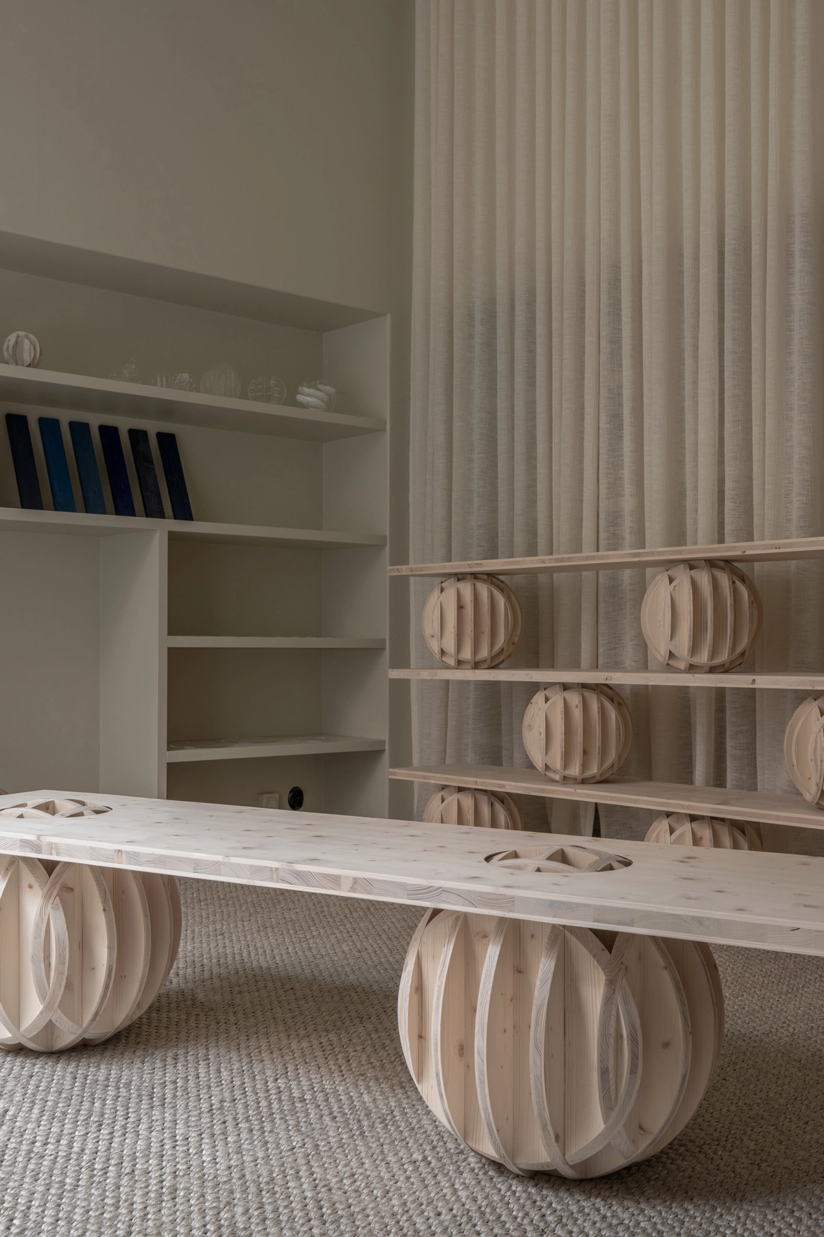 The sculptural furniture features horizontal planes that delicately balance on latticed spheres, offering a captivating interplay between weight and lightness, solidity and layering of planar surfaces.