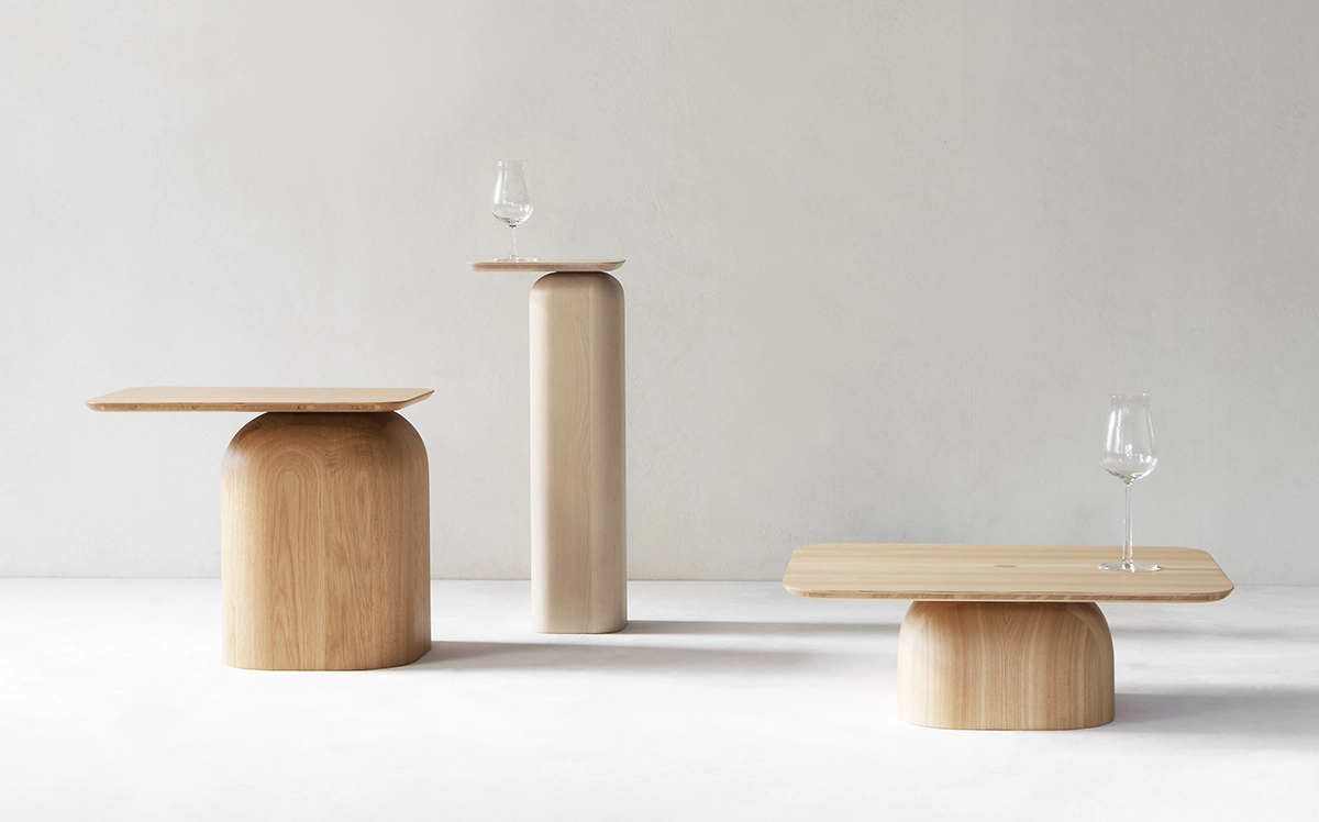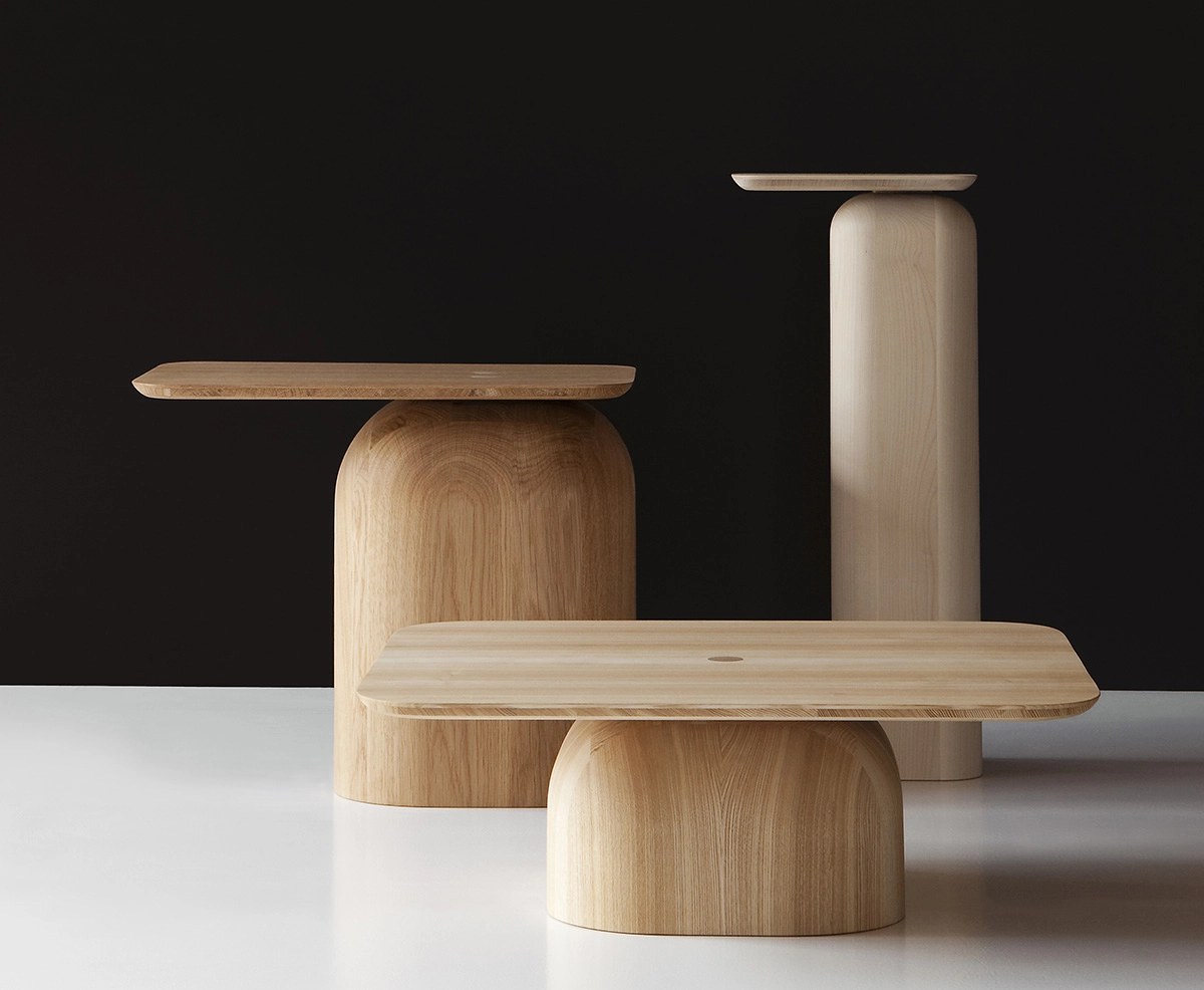 The tables are made of different wood species: birch, ash and oak. They are a natural combination together, but also bring out the different characteristics of the wood material and the contrasting forms of the products.