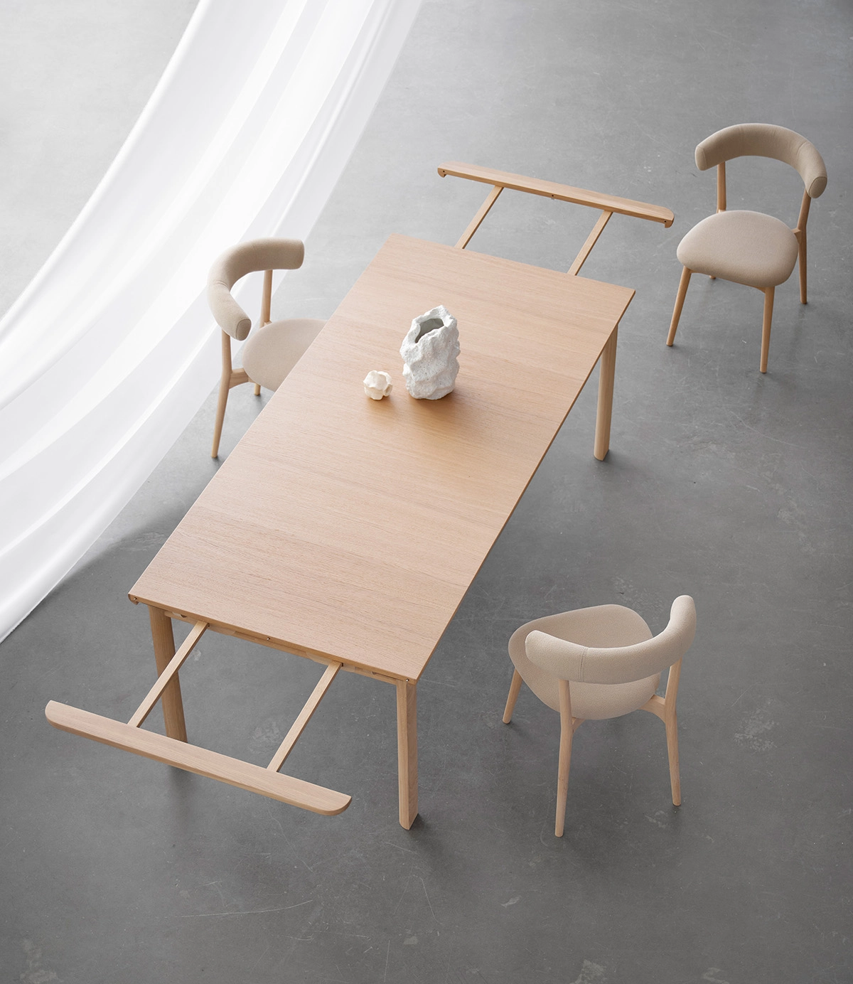 In the rectangular tables, I have worked to make the pull-out function itself an integrated and aesthetic part of the design. The pull-out is not hidden, but rather emphasised as a beautiful and natural component in the geometry of the table. This creates an elegant visibility of the function – a kind of honest gesture that emphasises the flexibility of the furniture without compromising the visual expression.