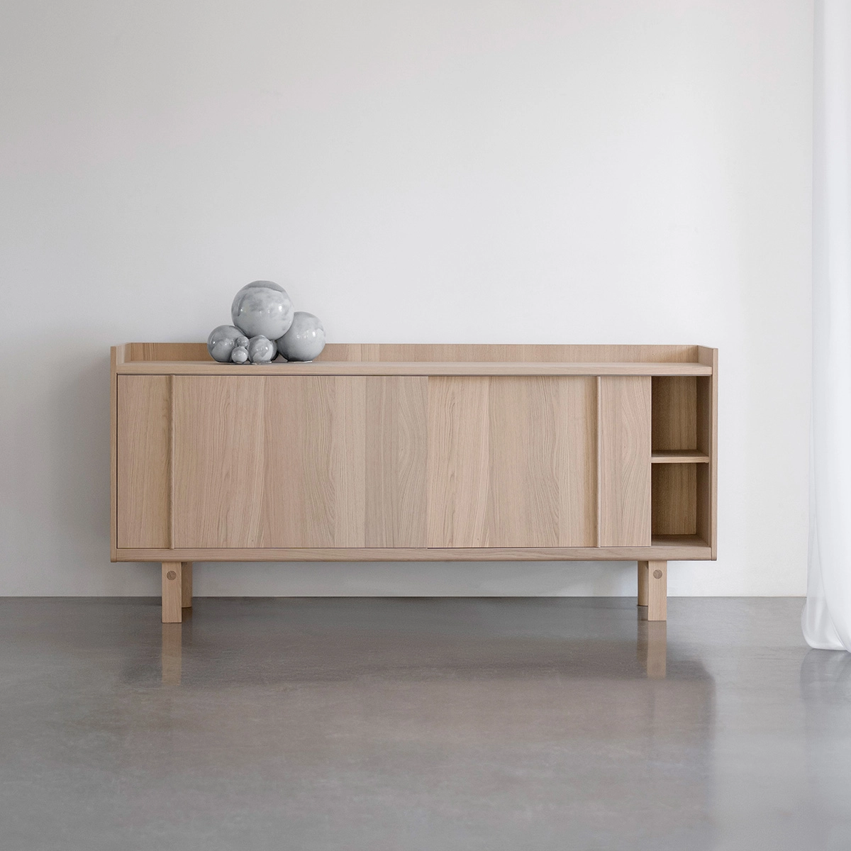 The storage furniture is created with a focus on both functionality and tactility. The sliding doors slide effortlessly aside using a solid wood round cane handle – a handle that is not only practical, but also provides a subtle, sensuous grip that you want to touch. The top plate is beautifully framed by the sides of the furniture, which both protects and frames the objects you choose to place there. The frame also allows for material contrasts and colour choices that can be adapted to the room and mood.