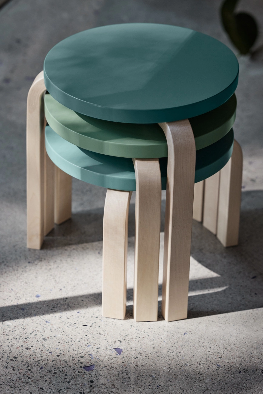 Designed as an extension of the tables’ glaze and material palettes, the stacking set of green-topped stools create an adaptable system of furniture that functions in many ways. Manufactured in Turku, Finland, Alvar Aalto’s iconic Stool 60 is the most elemental of furniture pieces.