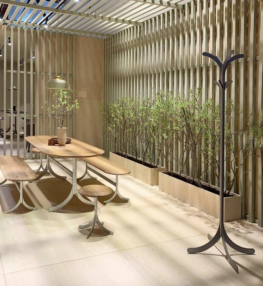 The original tables were made from Swedish oak and galvanized steel, to allow them to work both indoors and outdoors for the open-air café. The table then developed into a series of different table configurations, stools, benches and clothes hangers.