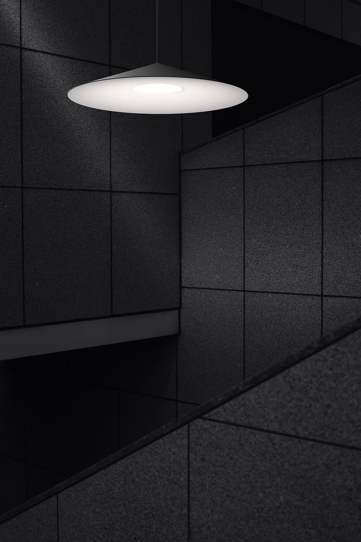 The Attic lamp, designed by Thomas Bernstrand in 2025, elegantly merges architectural inspiration with advanced lighting technology. Its distinctive sloping cone design features a white internal shade that enhances light distribution while creating visual impact.