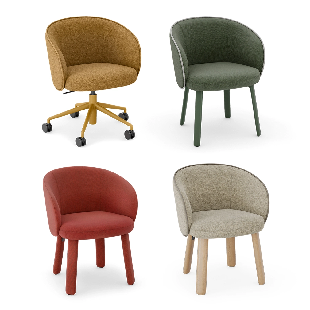 In addition to the 5-spoke swivel base, Aura armchair also offers the options of metal legs, upholstered legs, or solid oak legs. The 5-spoke and 4-legged frames in metal, are available in our colour concept Colours by Materia (CbM). Besides the armchair, the Aura range includes a 2-seater and a 3-seater sofa as well as an easy chair. All variants come with or without piping. Choose between black castors with intermittent brakes or black glides.