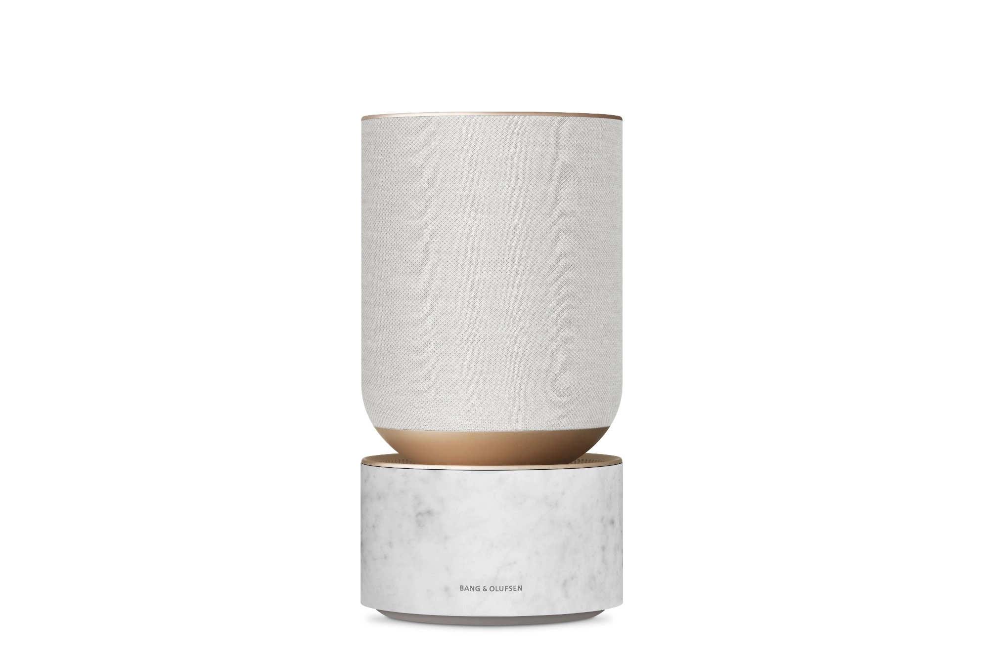 The Beosound Balance features golden-hued aluminium detailing, white knitted textile and a Carrera marble base – marking the first time that Bang & Olufsen has used Carrara marble. The organic nature of the marble means that no two speakers are identical.