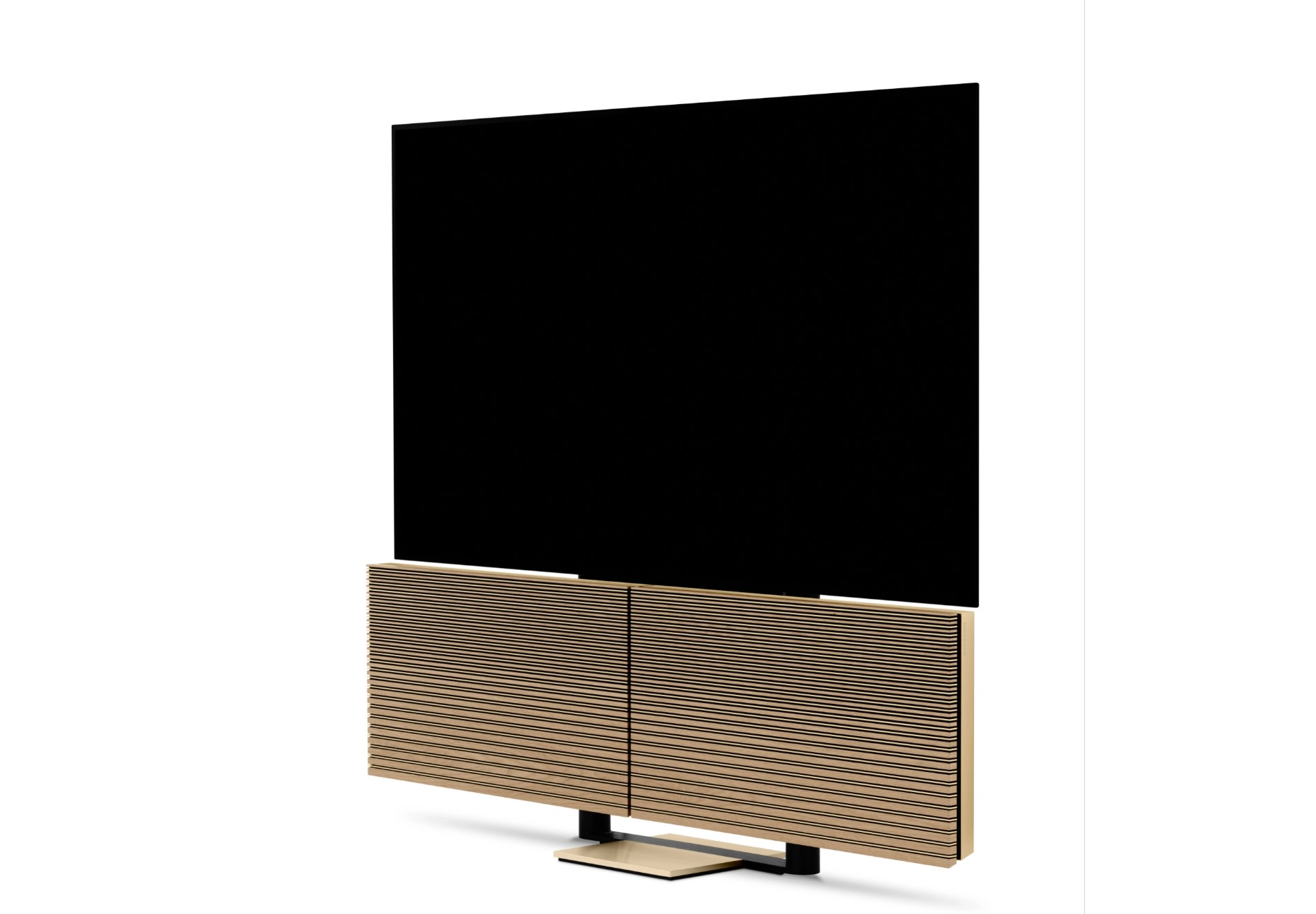 The Beovision Harmony represents Bang & Olufsen’s premium TV experience and features a new golden-hued aluminium sound centre, a matching floor stand and a hand-crafted speaker cover made of aluminium and light oak veneer. Beovision Harmony comes with a Beoremote One remote control, made out of a single piece of gold tone aluminium.