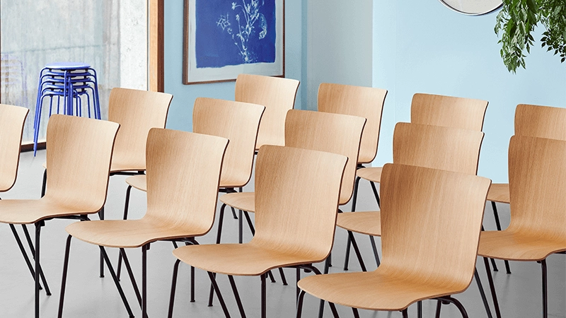 Beauty and function converge in a stylish veneer stacking chair by Fritz Hansen.