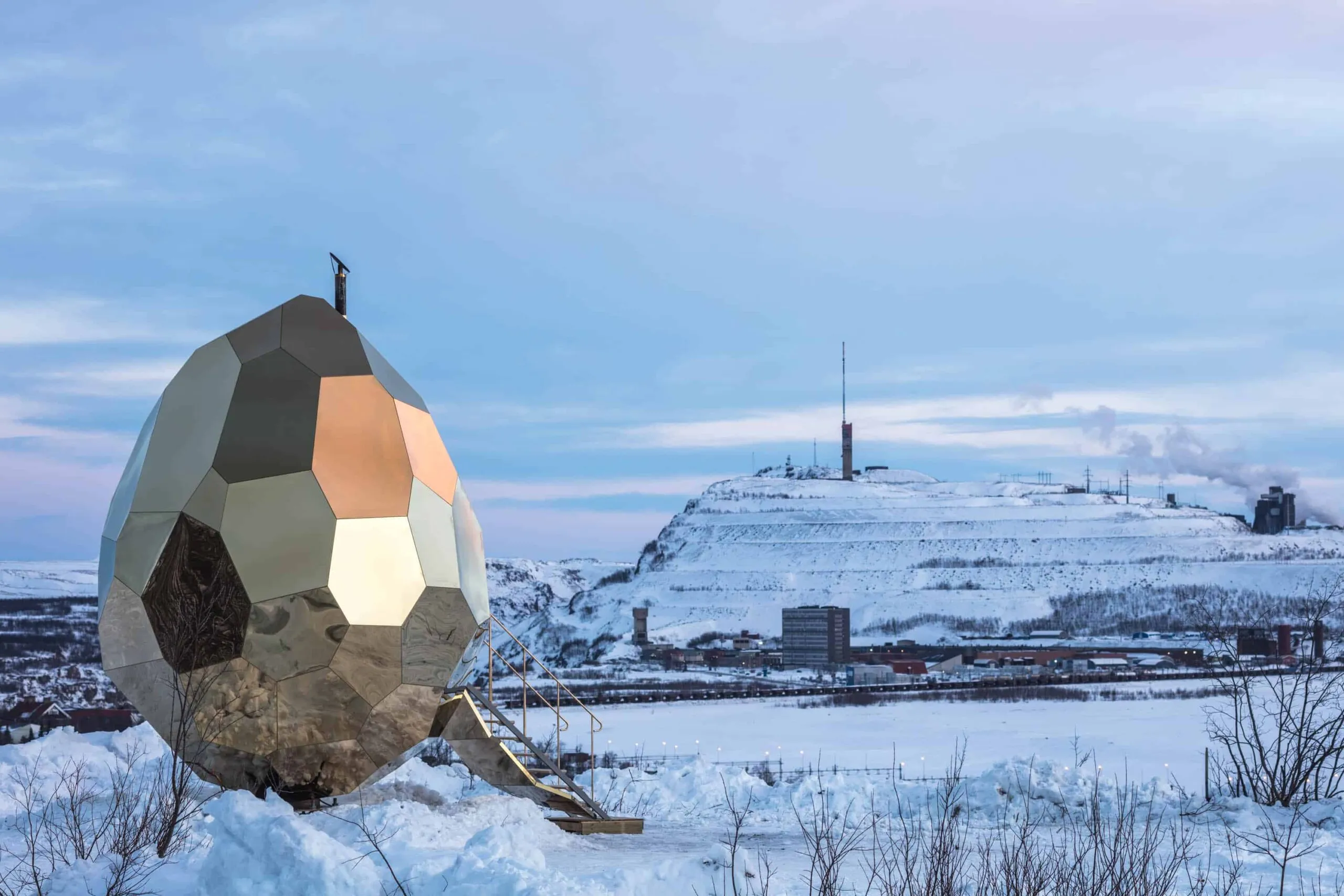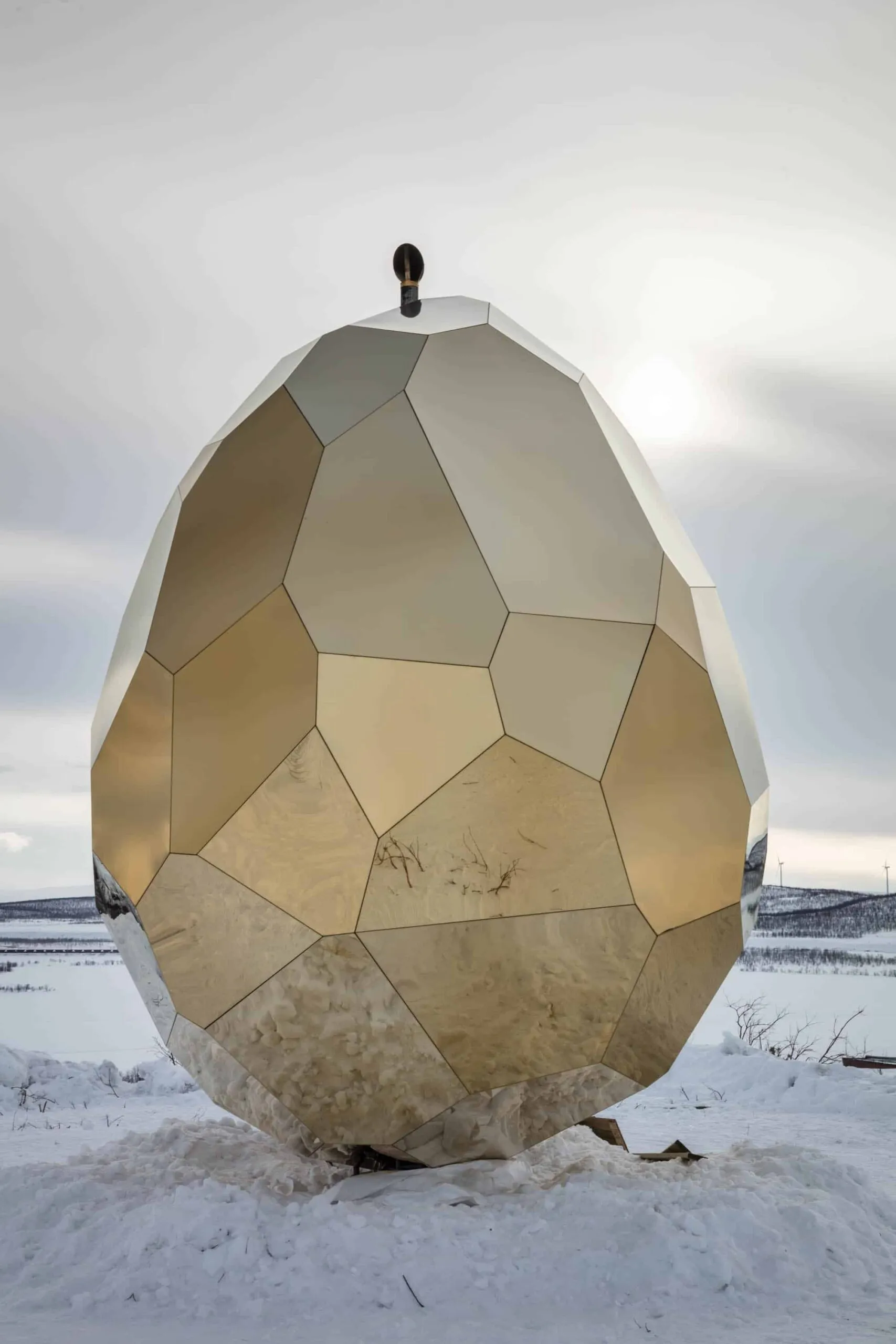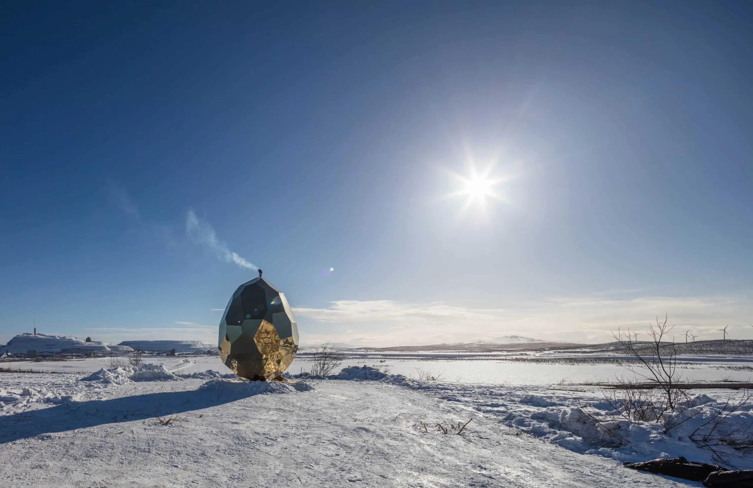 The egg is made out of stainless golden mirror sheeting, its multifaceted form breaking up the surroundings that it reflects into a multiplicity of different mirror images. Landscape, mine, town, sky, sun and snow are here combined into a fragmented image that can evoke associations with the complexity spanned by today’s discussion about climate and sustainable community development. The egg’s interior has been formed out of wood, with the wall panels and floor decking made out of pine and the bench of aspen. In the centre of the egg stand the wood-heated, heart-shaped sauna stove made out of iron and stone. The temperature inside the egg varies between 75° and 85° Celsius.