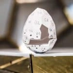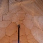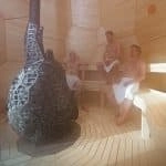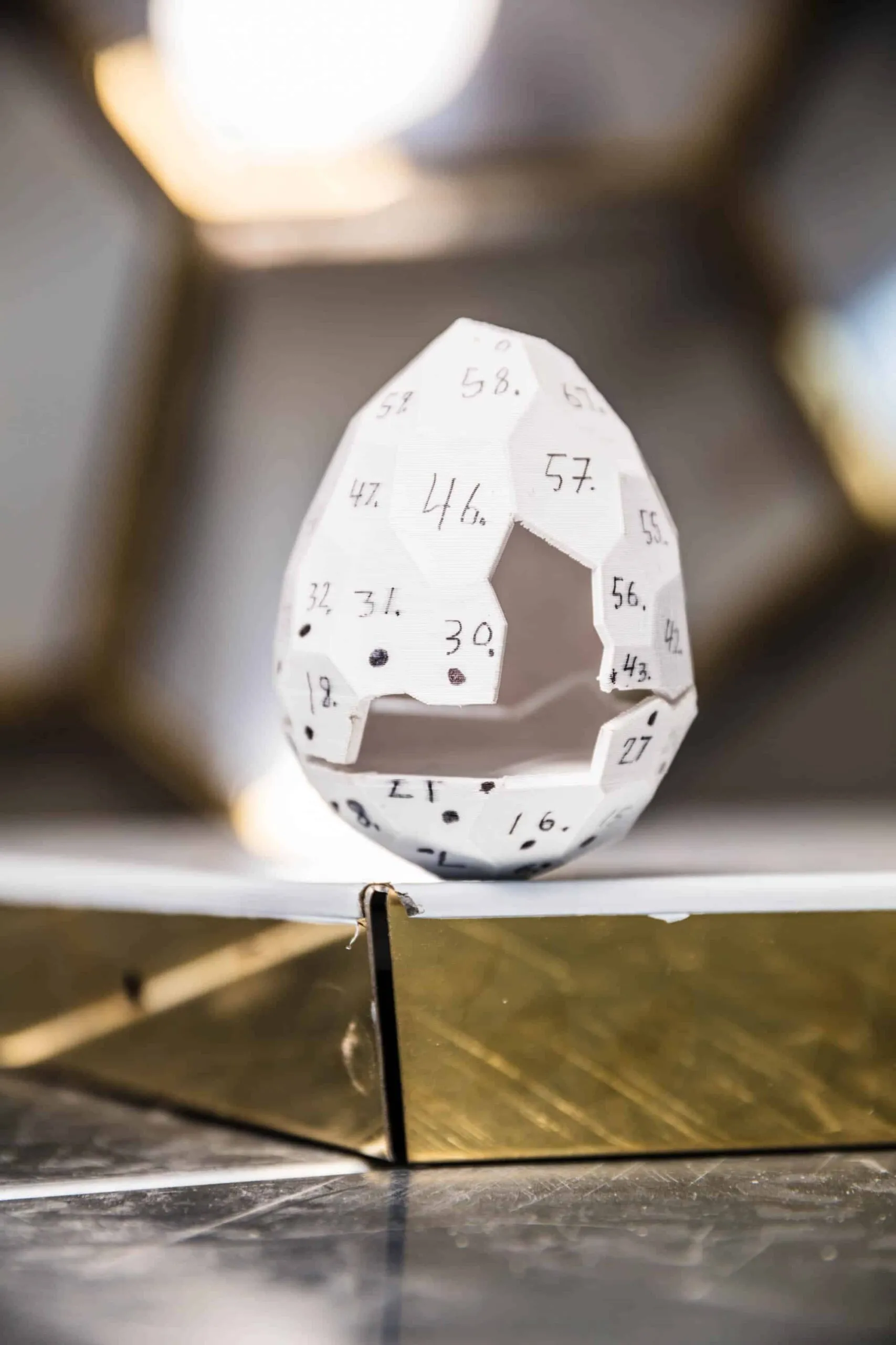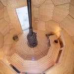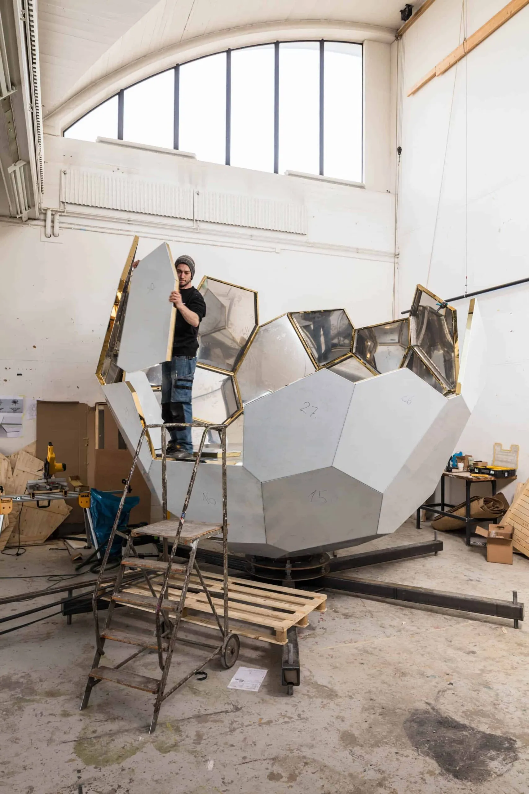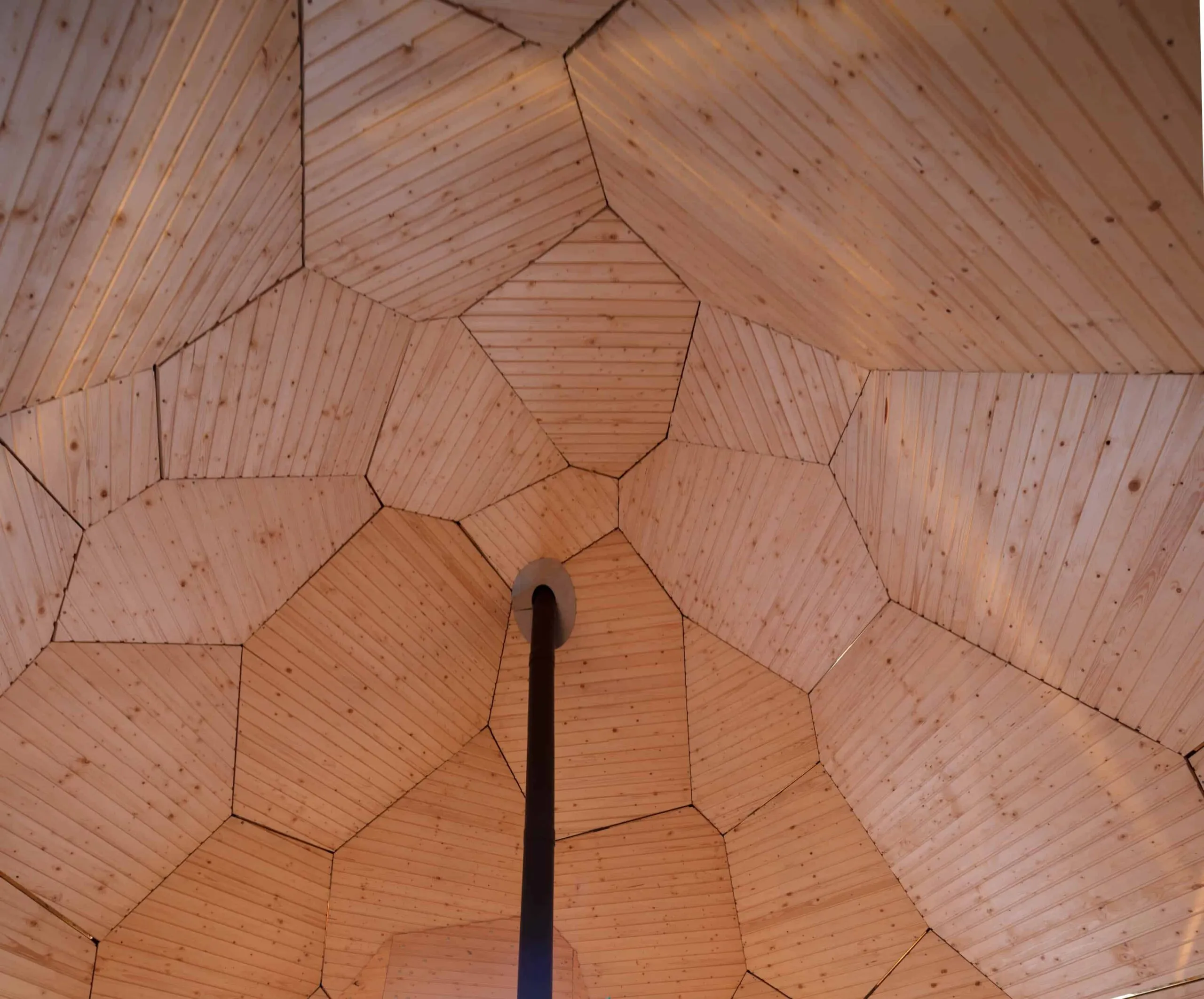 The egg is made out of stainless golden mirror sheeting, its multifaceted form breaking up the surroundings that it reflects into a multiplicity of different mirror images. Landscape, mine, town, sky, sun and snow are here combined into a fragmented image that can evoke associations with the complexity spanned by today’s discussion about climate and sustainable community development. The egg’s interior has been formed out of wood, with the wall panels and floor decking made out of pine and the bench of aspen. In the centre of the egg stand the wood-heated, heart-shaped sauna stove made out of iron and stone. The temperature inside the egg varies between 75° and 85° Celsius.