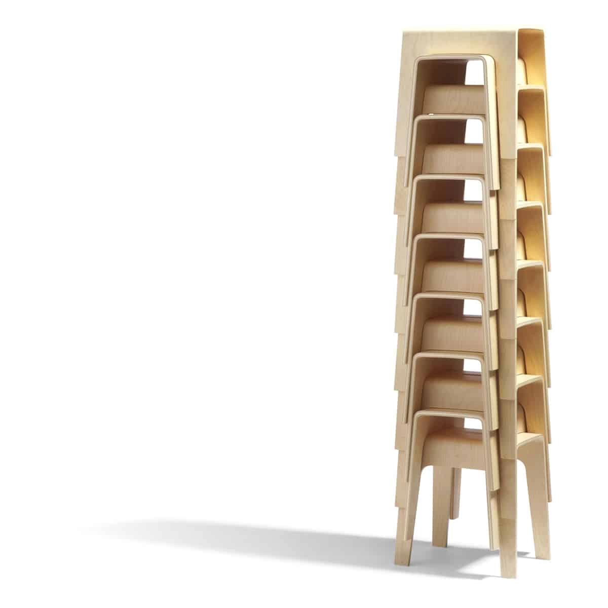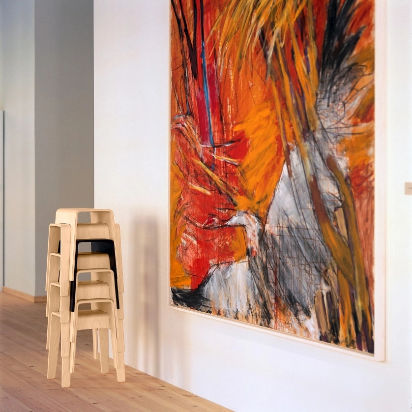 Launched in 1994 Bimbo was directly awarded with the Forsnäs Prize and is now is turning 25 in 2019. Since the launch, Bimbo has received several awards, among them the Golden Chair as Best Classic in 2005, then only 11 years old. Bimbo is just as popular now as it was when it was launched, a true classic now being celebrated with new walnut and ash veneer surfaces. The original is made of compression-moulded birch wood with a birch or oak veneer finish. The cut-out on the seat makes it easy to move Bimbo around and use wherever it is needed, for sitting or reaching awkward places. Its graphic form can be stacked seamlessly to create a beautiful tower in the room where it is being stored.