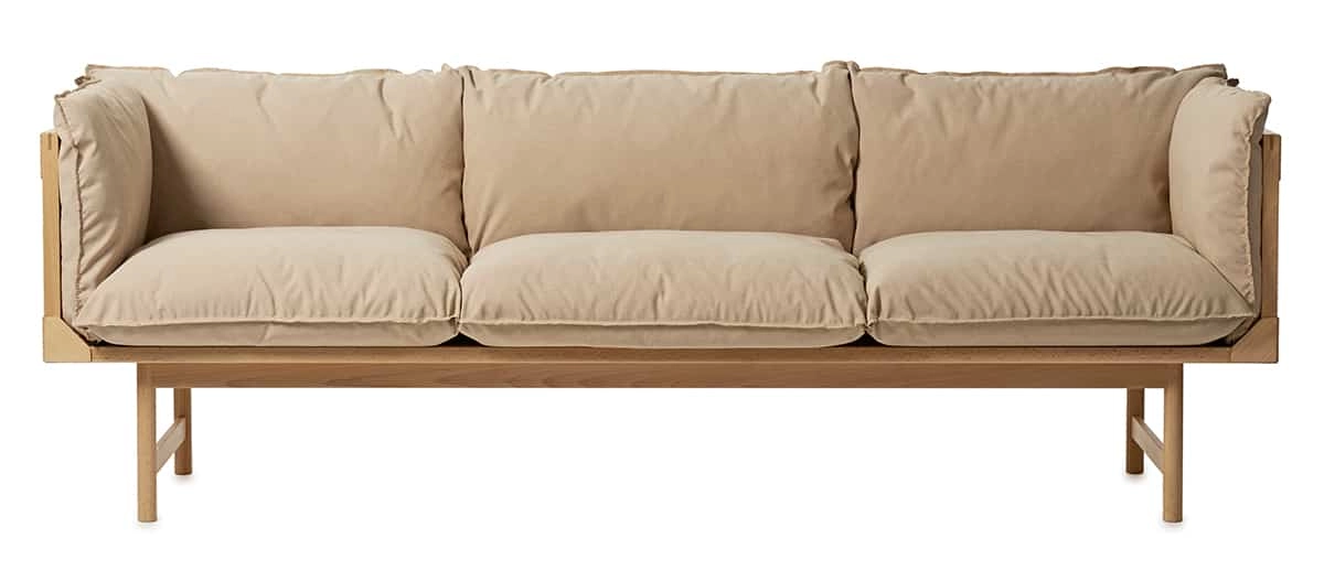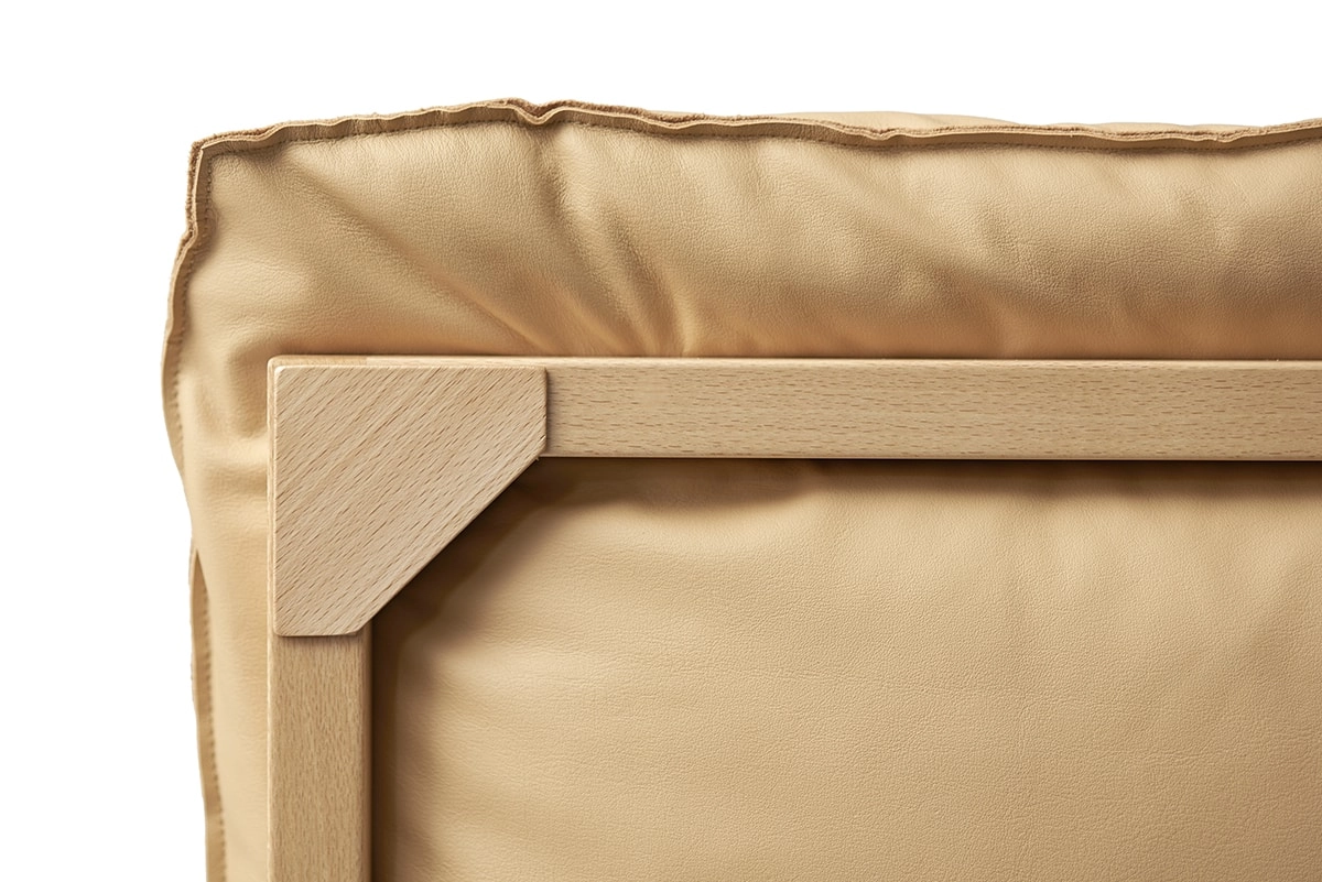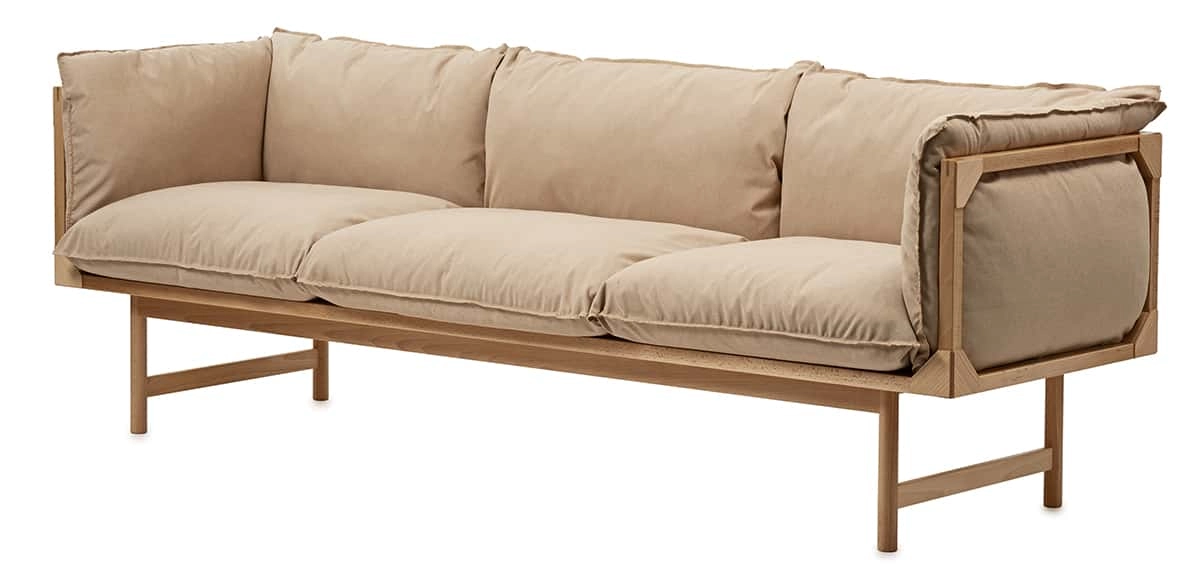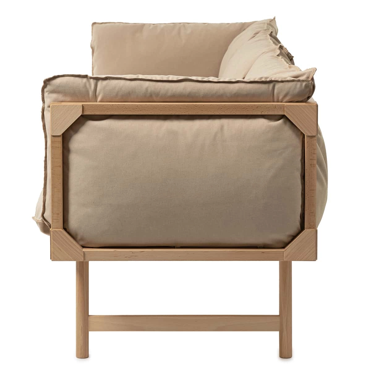 The frame and all the visible wooden components are in beech. The fluffy cushions are filled with down and