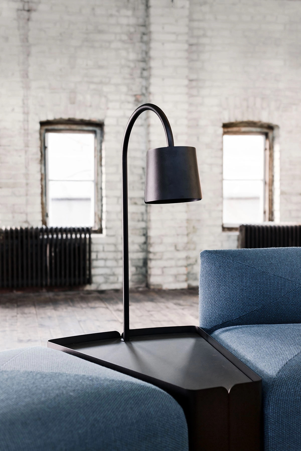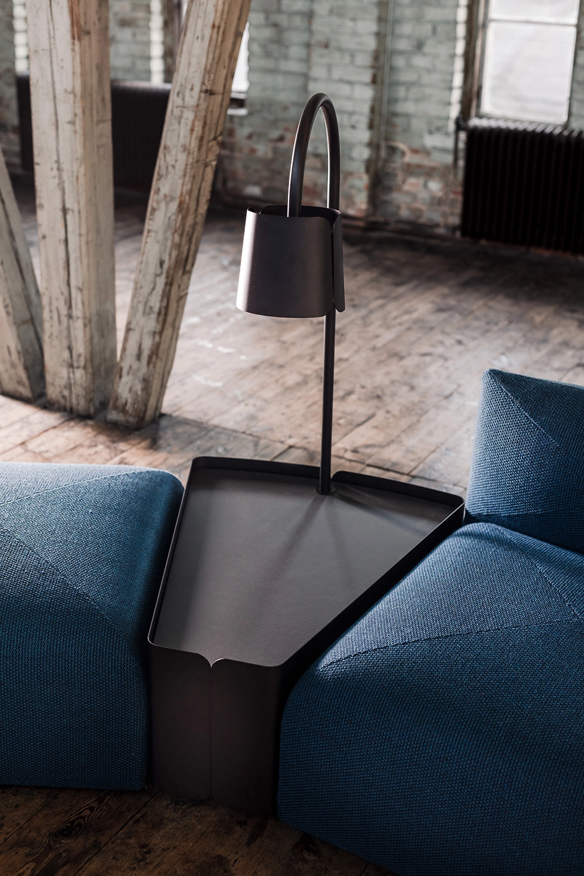We’d like to introduce the Blob Table, a new member of the Blob family! An accessory that will enhance your Blob setup and its environment. It is made of a sheet metal frame with a black linoleum top, making it lightweight and easy to move, just like the other Blob components. The Blob table is available in three sizes: full, half, and triangle, with the possibility of adding a lamp with an LED light source or a charging port. Design by Helene Tiedemann.