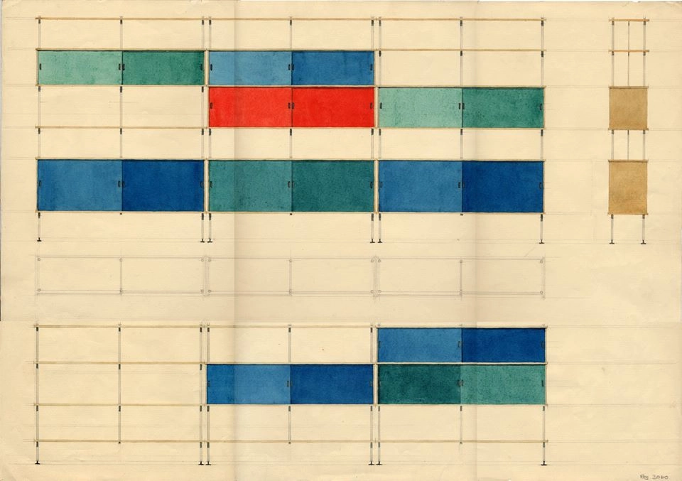 The flexible and multifunctional shelving system is the embodiment of simplicity with its veneered shelves of varying sizes and a wooden cabinet, all of which can be assembled using a frame made of cylindrical metal bars of different lengths. The shelves and cabinet module can be combined according to your needs, and the blend of open and closed modules creates a rhythmic and transparent expression.