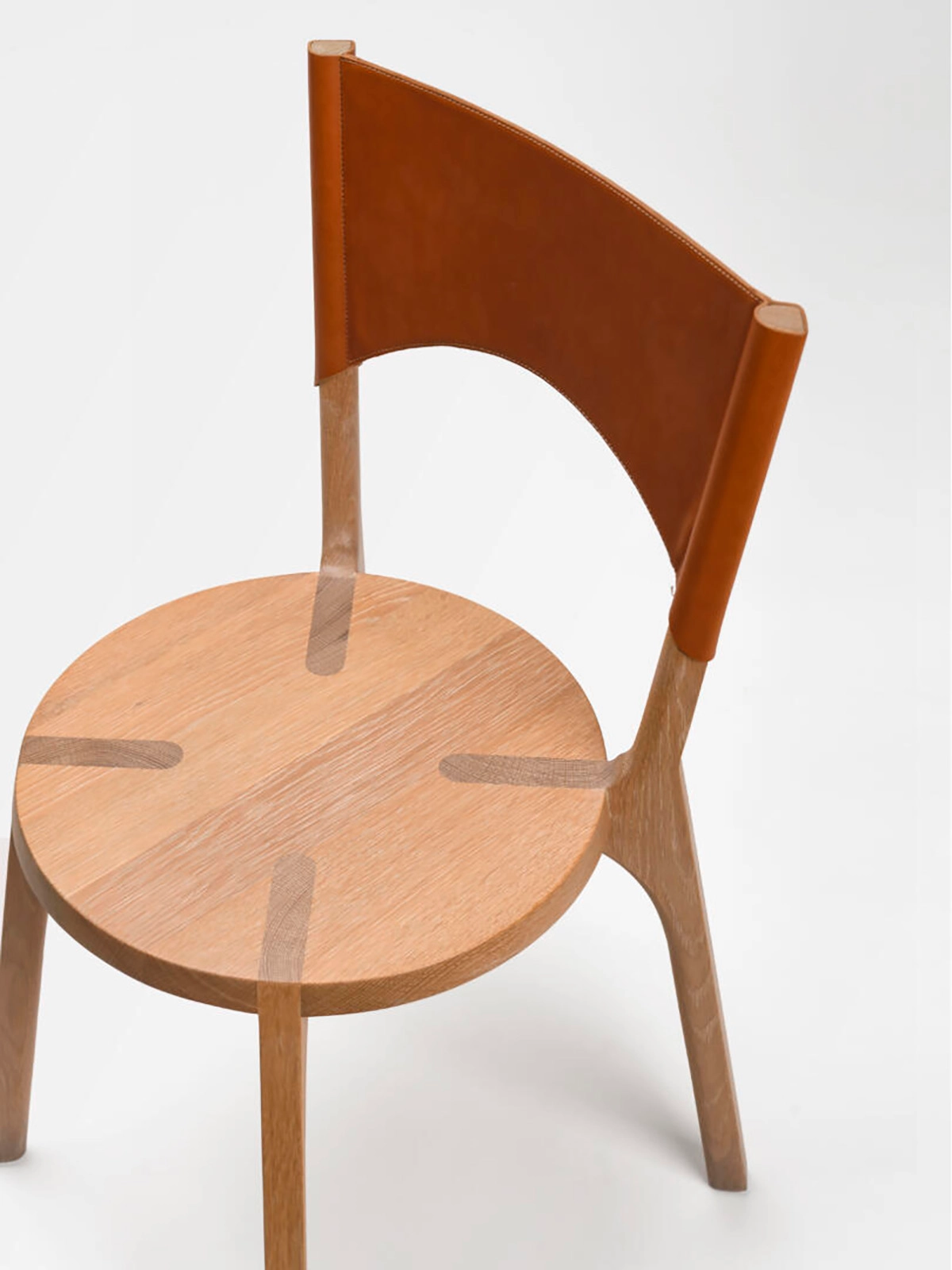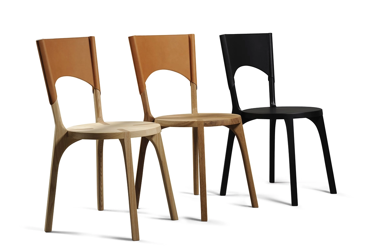 Café Tattoo chair, designed by Gert Wingårdh & Sara Helder, is a charming, minimalist, and youthful chair with clean architectural lines. The chair is the latest addition to the popular family of Tattoo stools and bar stools. Café Tattoo is a lightweight and stackable chair featuring a backrest in 2mm thick natural saddle leather. Each leg joins the seat by fully penetrating it, leaving a charming woodgrain mark on the seat top. The chair is designed for use in public spaces such as restaurants, bars, meeting rooms, but it is equally suitable for residential use. Standard versions of the chair are available in oiled ash and oak with brown leather backrest and a black-stained version with black leather backrest. Both plain and hand-carved versions of the chair is available.