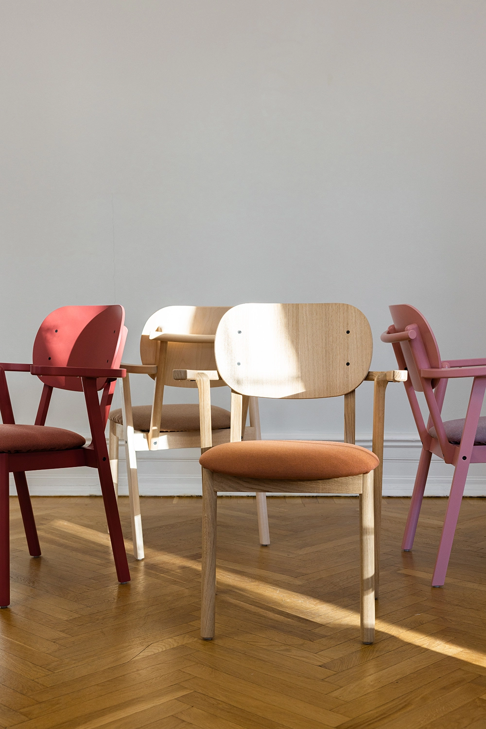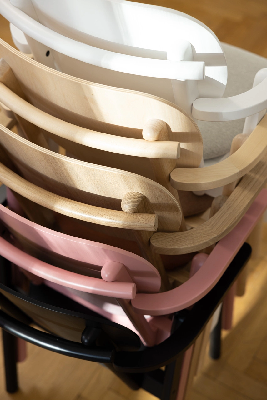 The stackable chair and armchair originates from a construction concept – one wooden hub joining …
