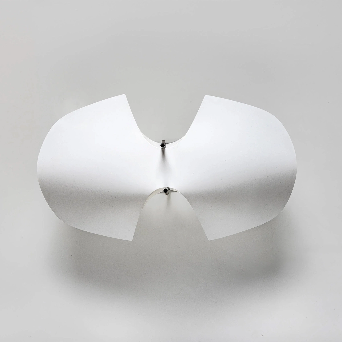CHO lamps are the result of a study on shapes that appear when adding pressure to an oval piece of paper. A sheet with two curved pressings, gently wedged into a slim metal frame. As a wing catch carrying itself resiliently between two pylons. Here it unfolds into a poetic shade that spurs on creative interpretation of the beholder and changes at the point of view.