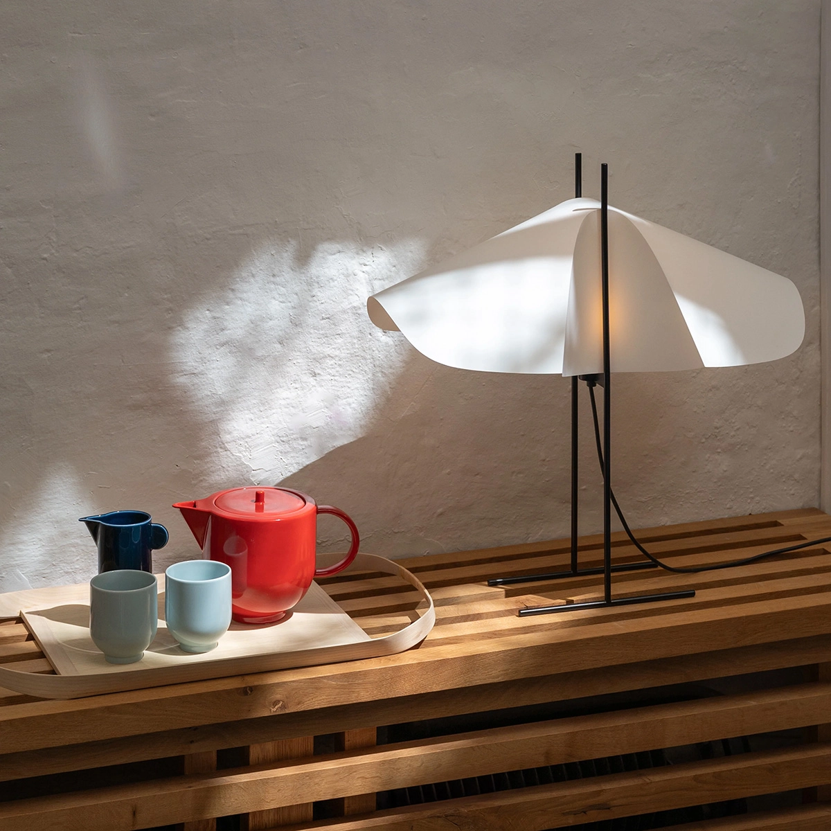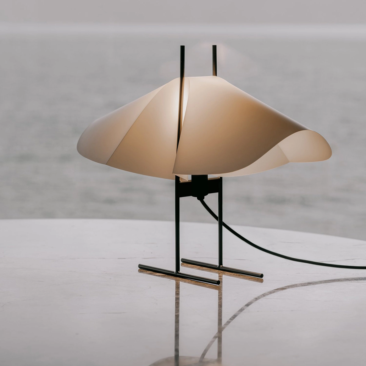 Cho means butterfly in Japanese which is how the shape speaks to the designers. The lightness of the shade meeting the solidity of the steel base, white meeting black.