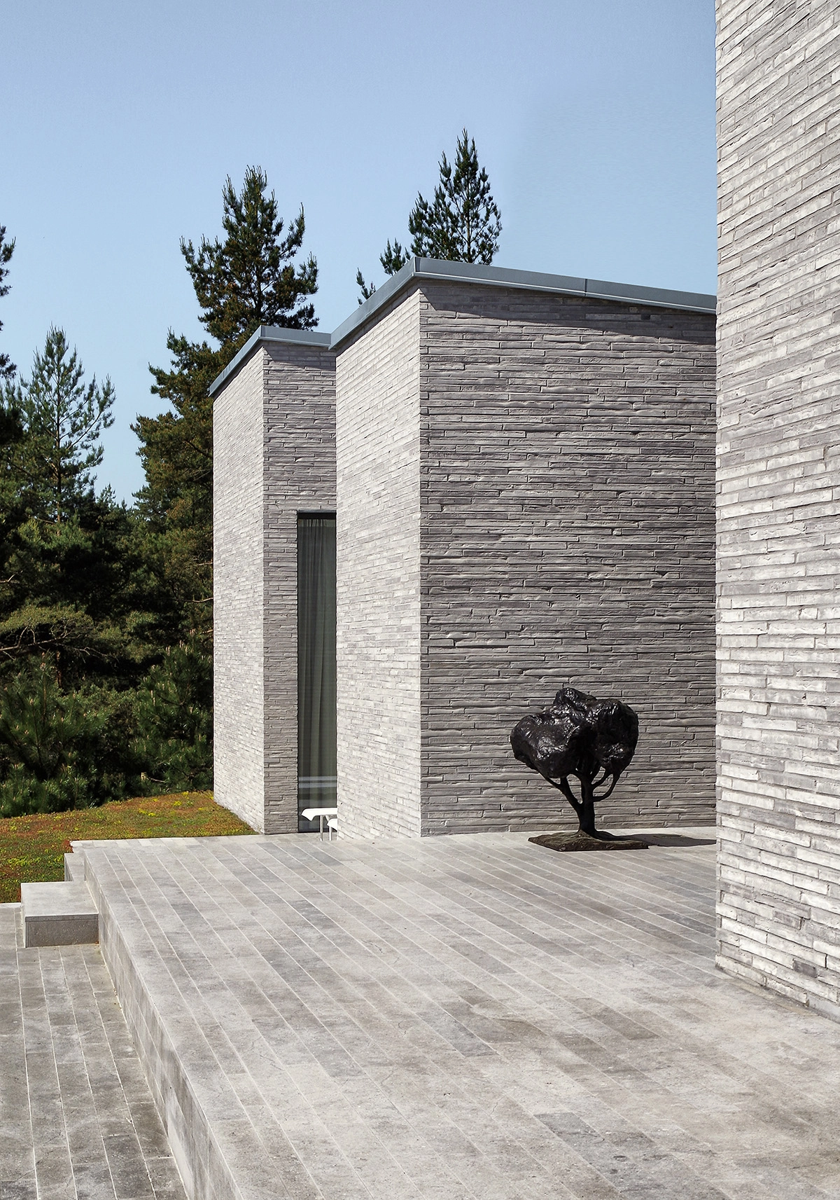 The solution came with an imaginary slicing up of an elongated box and dislocating of the parts in alternating, parallel order. Thus, ending up with a number of outwardly open courtyard terraces – one in each gap. In principle, like the camshaft in a multiple-piston engine. In the façade, each protruding box is a closed wall while full glazing is used inside the courtyards – sometimes at their deep end, sometimes sideways facing. Besides framing each view, the outlooks become very private.