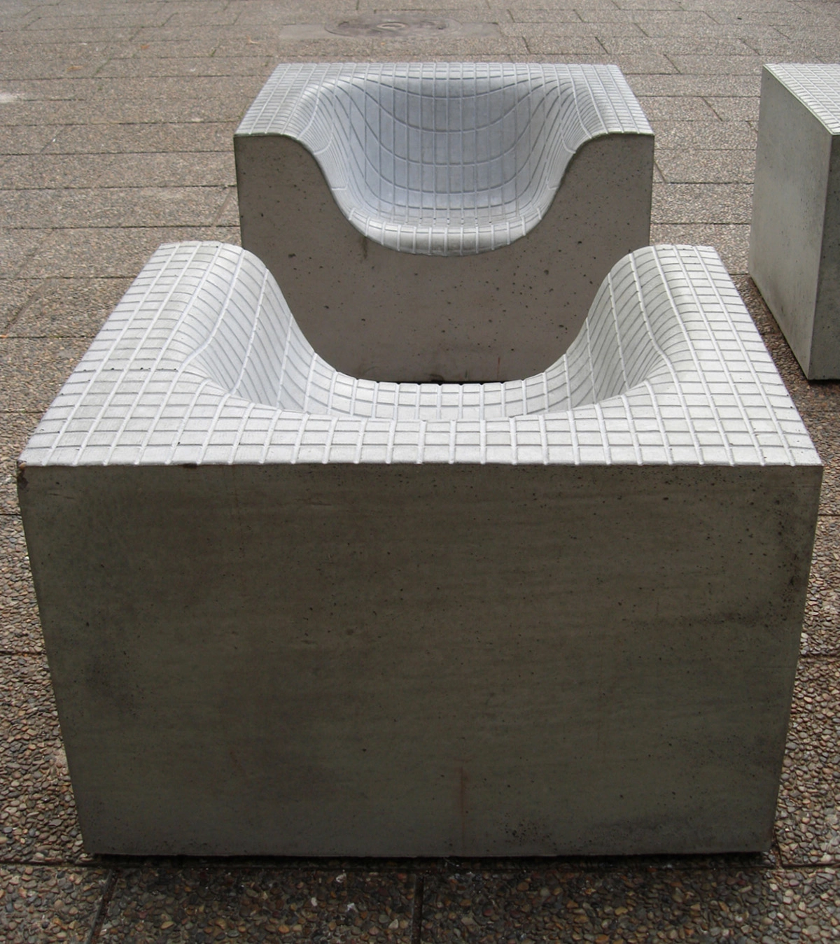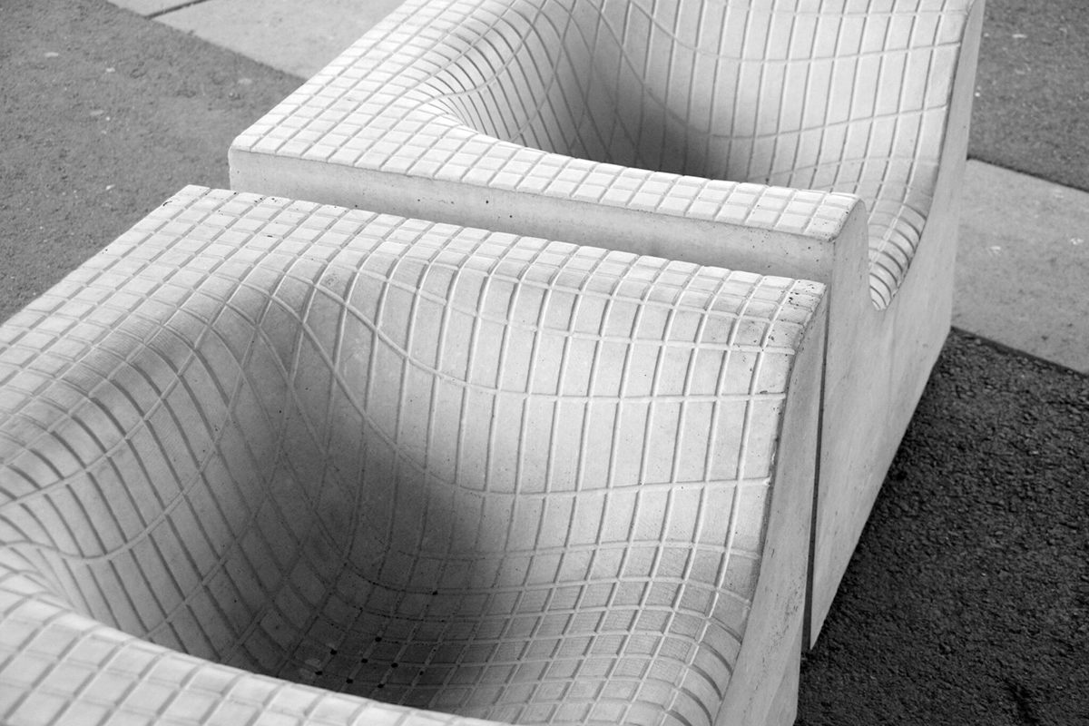 These moulded concrete seats are massive, but their sleek shapes are offset by the weightless lines of the Grid chair. The concrete is smooth and unblemished, giving way to the Grid chair’s wave-like patterns etched across their surfaces. Whether paired with the Grid chair or used on their own, these concrete designs create a striking permanent feature in any garden or terrace.