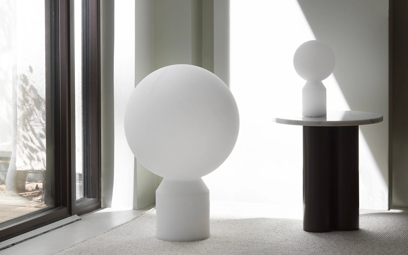 Its immediately captivating, almost caricatured form offers a playful take on the traditional table lamp, merging a cylindrical base with a spherical lampshade for a perfectly simple, yet bold and sculptural silhouette.