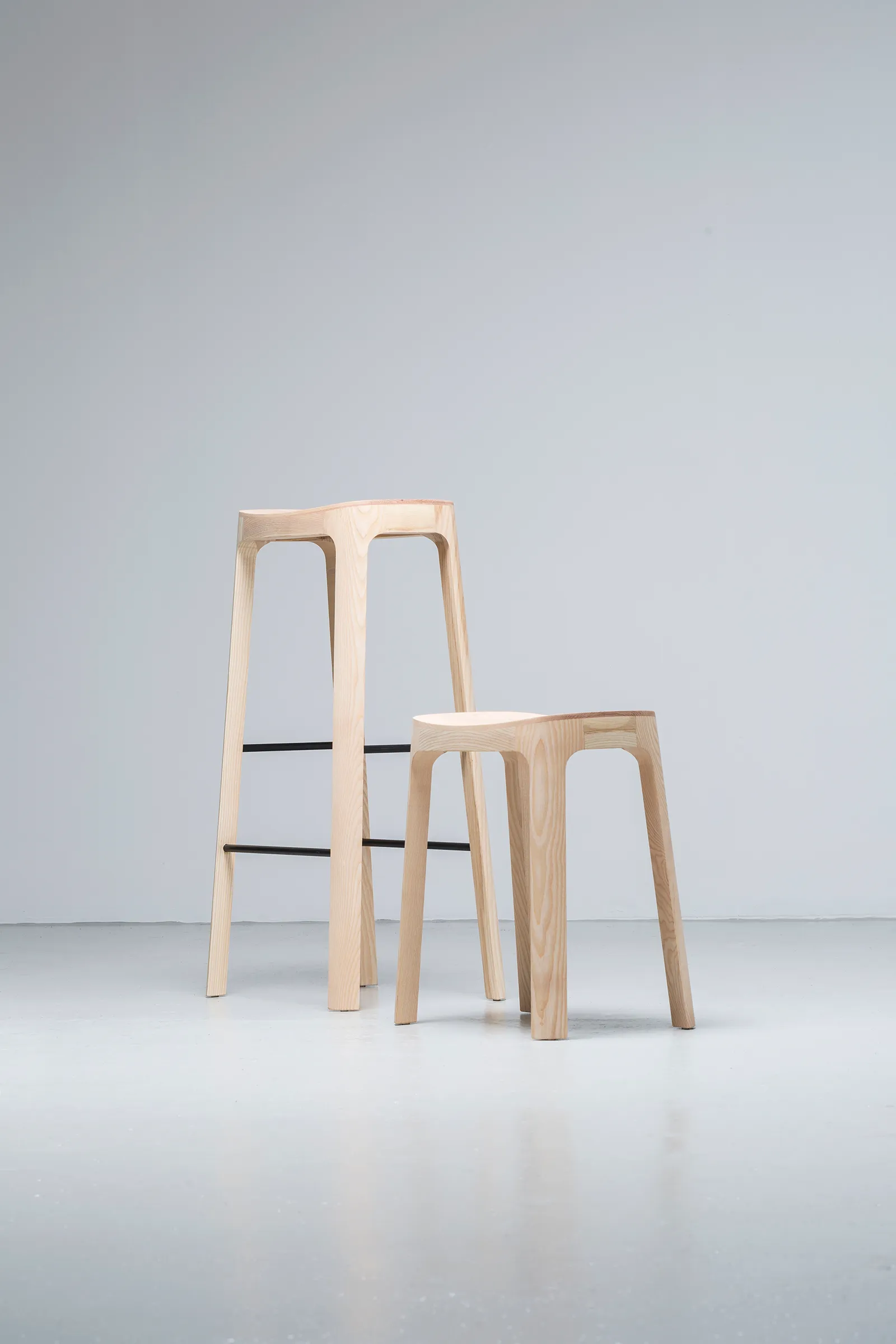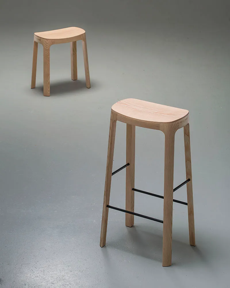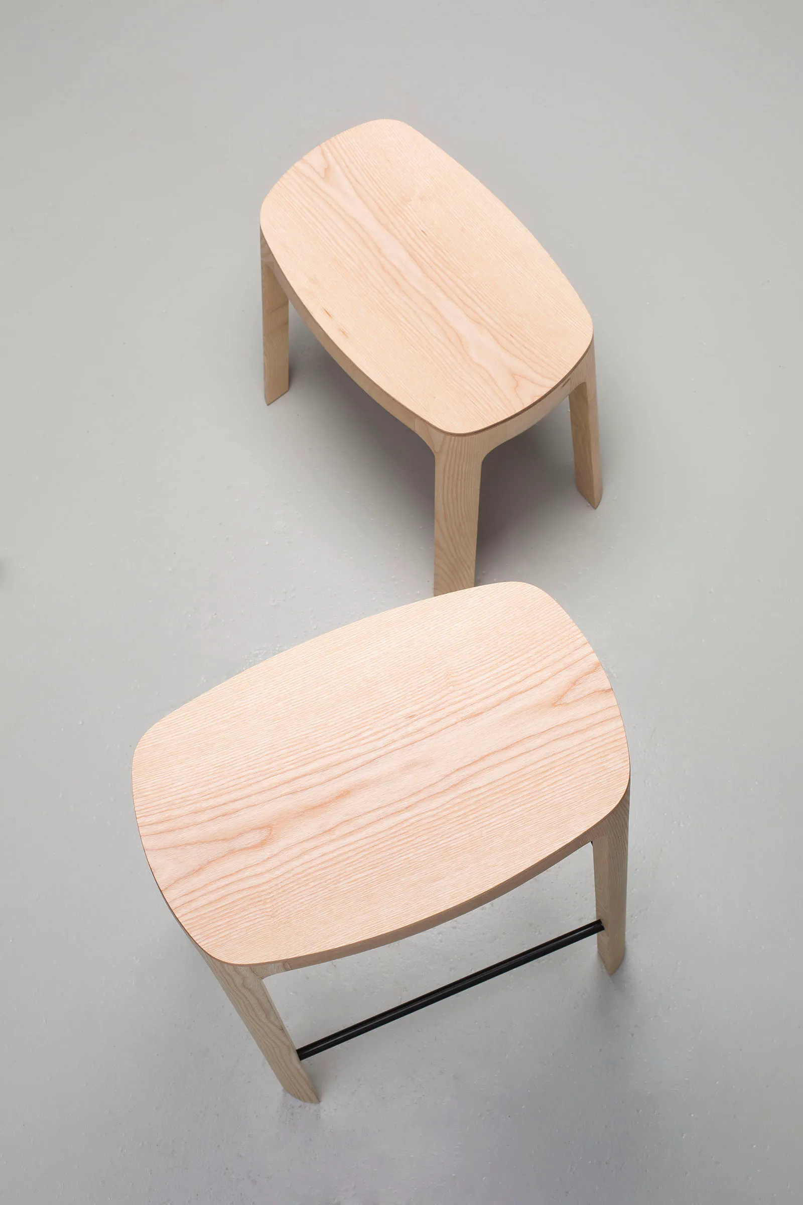 The aim was to create a robust stool with a slender width whilst still retaining comfort. The purpose for this is to maximise space at bar and work areas whilst giving a relaxing sit for long seating periods. The gentle curves and strong silhouette add to the inviting nature.