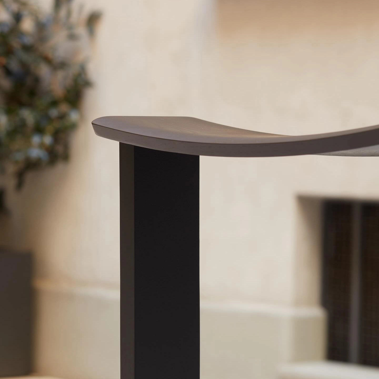 Crafted in solid FSC®-certified ash wood with powder-coated steel runners, the stool features an extruded aluminum footrest that matches the color of the feet. Its deep seat curvature delivers surprising comfort despite the minimal form, embodying Rybakken’s philosophy of essential design with iconic silhouettes.
