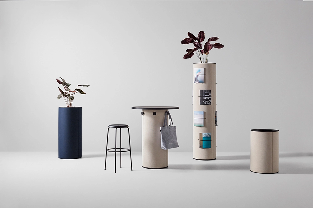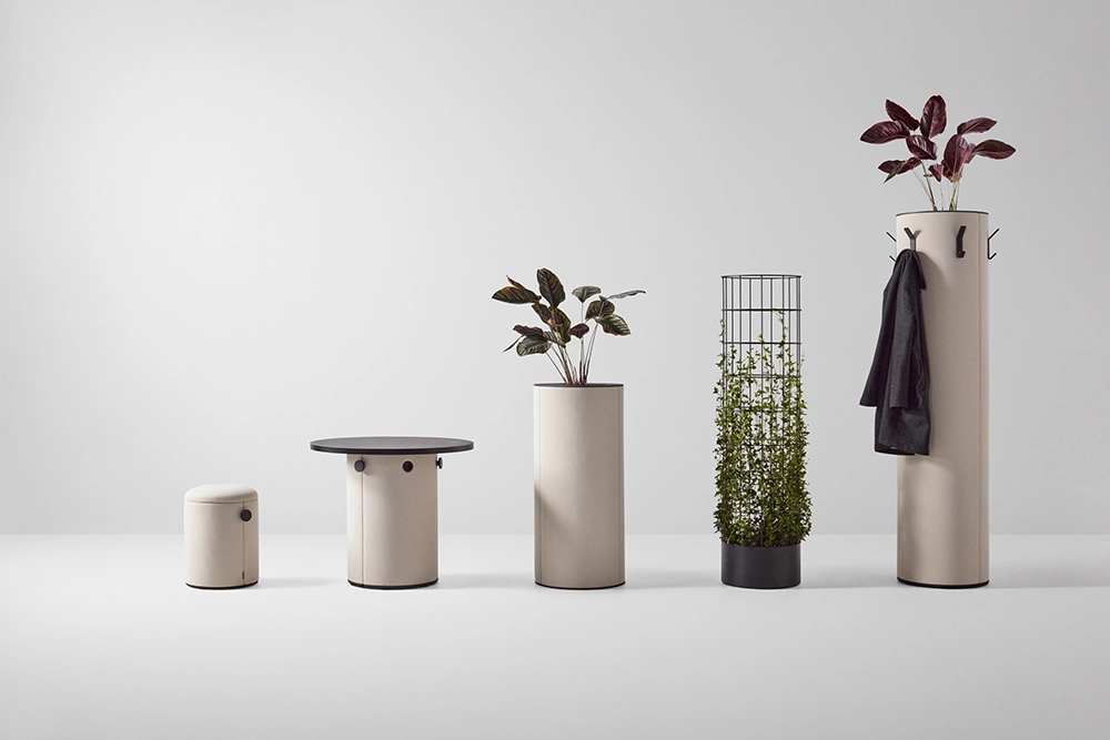dB Pillar includes tables, stools, and pillars in various heights. Several pillars with different additional features are available: pillars with whiteboard, with support for climbing plants, with magazine holders, with flower pots, and with coat hangers.