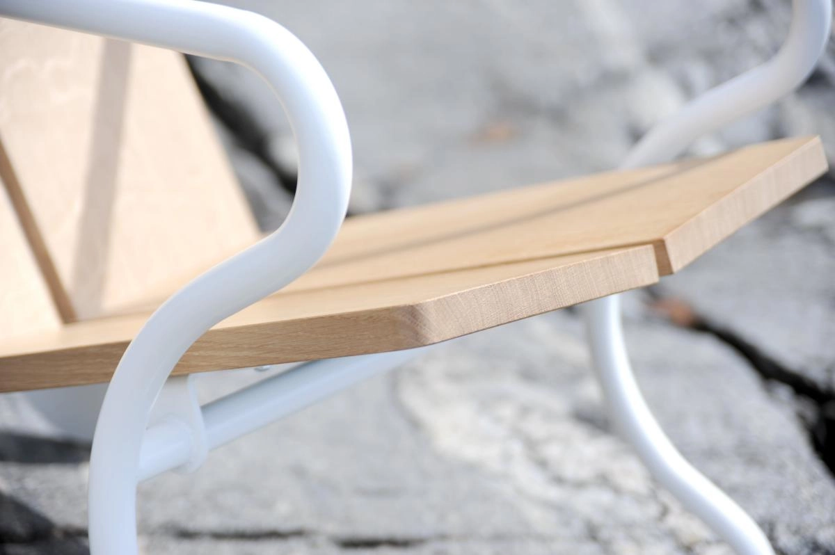 »This is sitting comfort with a minimum of gestures. The design is solid, with a soft curvature of the wood in the seating area and narrow, functional armrests that make the chair very comfortable to sit in. It is neat and easy to move – simply a really good outdoor furniture. But Oona is a new acquaintance, a genuine personality, reminiscent of something as original as the childhood box car – and the joy of it. Welcome to the world, we hope you stay long.«