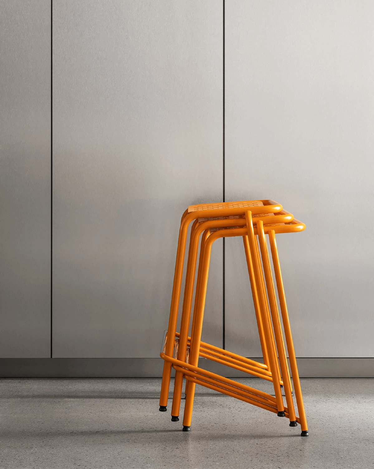 A22 is a stackable, highly versatile stool designed for impromptu meetings and quick breaks in dynamic environments — at home or at work. Its comfortable seat is angled slightly forward to encourage occupants to stand occasionally and do their bodies a favour. To facilitate recycling and reuse, the stool is made entirely of steel, without any bolts or screws. A22 can be used both indoors and outdoors.