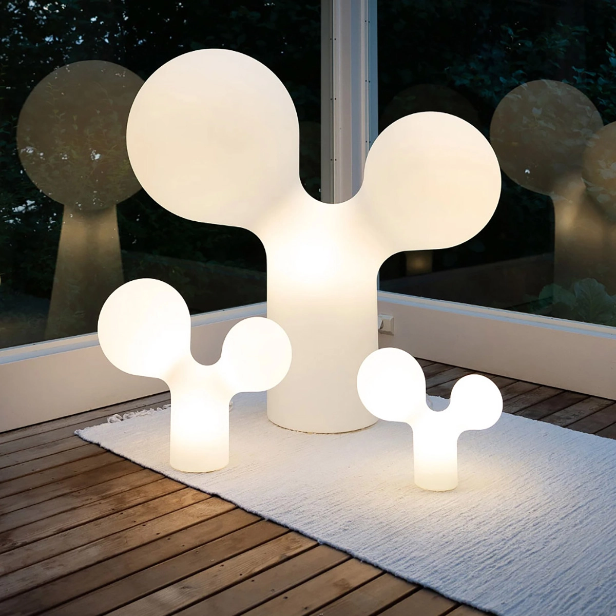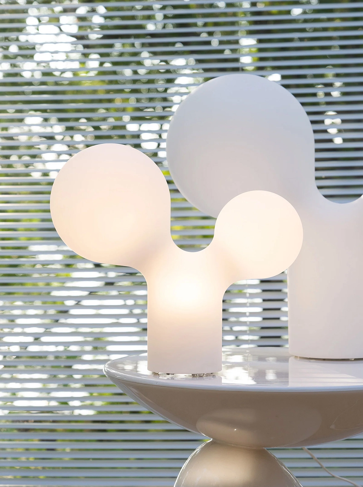 The DOUBLE BUBBLE series of lamps includes two table lamps and one sculpturous standing lamp