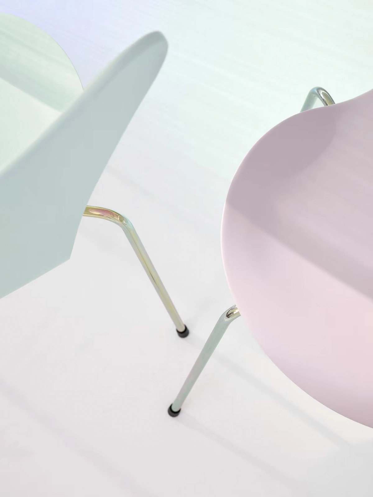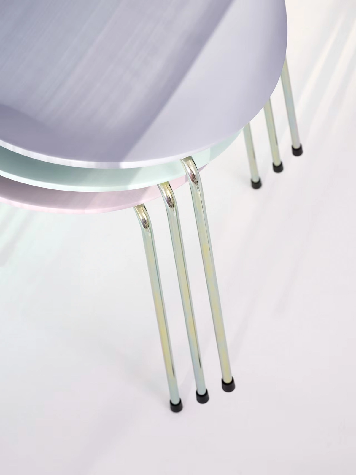 The 7:14 AM palette is a limited-edition series available from March through 2025. Colours are 7:14 AM Blue, 7:14 AM Violet, 7:14 AM Pink, 7:14 AM Beige, 7:14 AM Green. It is available with a new iridescent base, a zinc chrome which reflects the light and the colours of the shells, created especially for the limited-edition palette. The chair can also be purchased with a classic chrome base.
