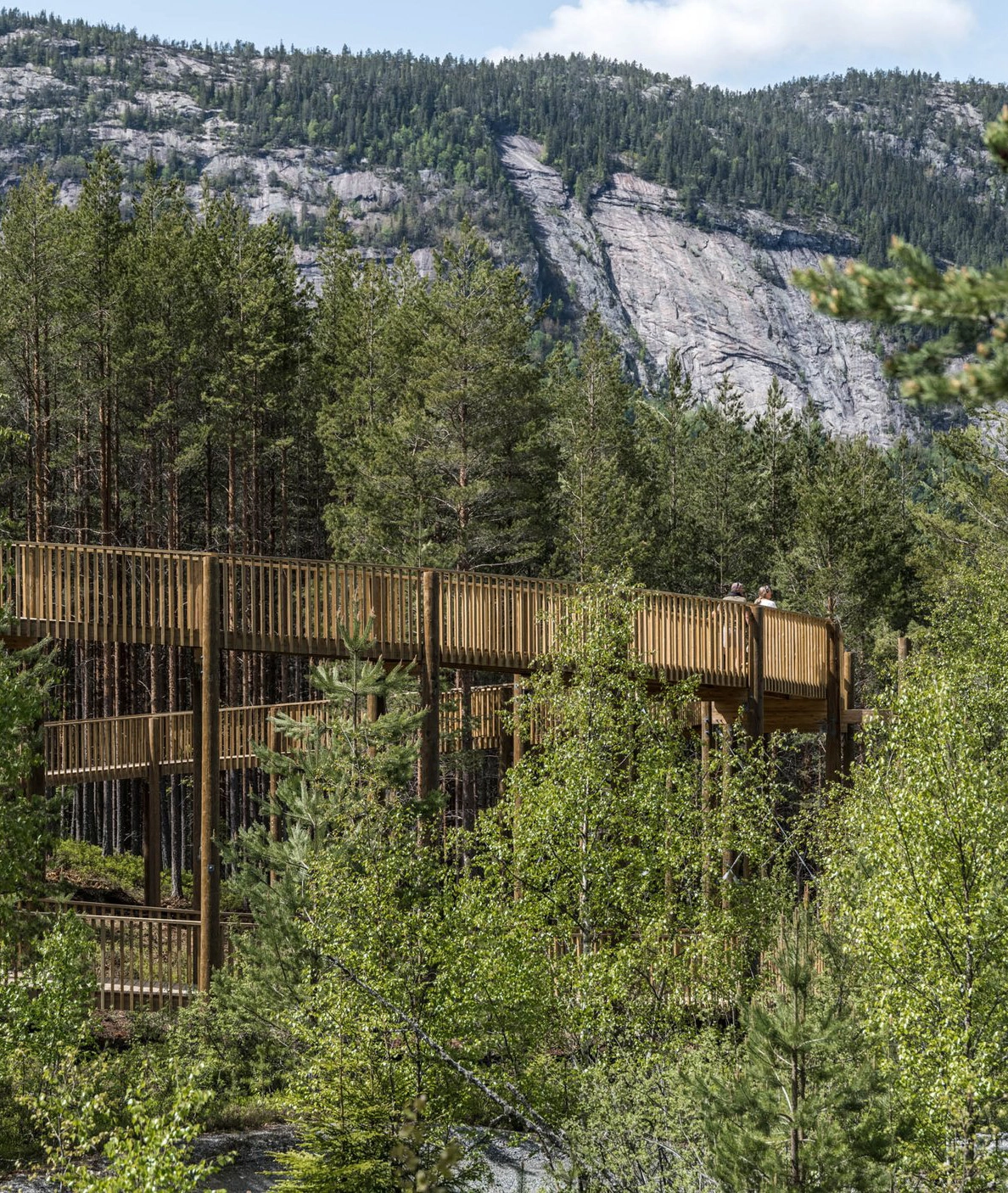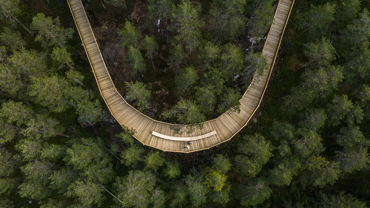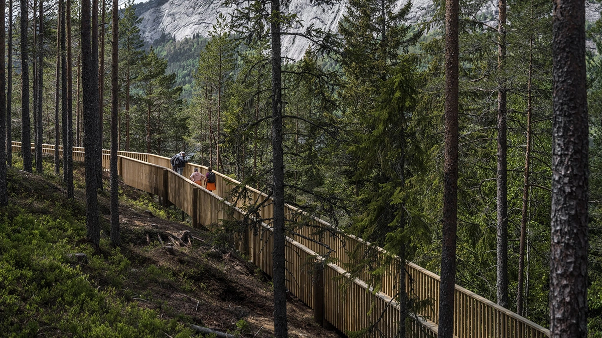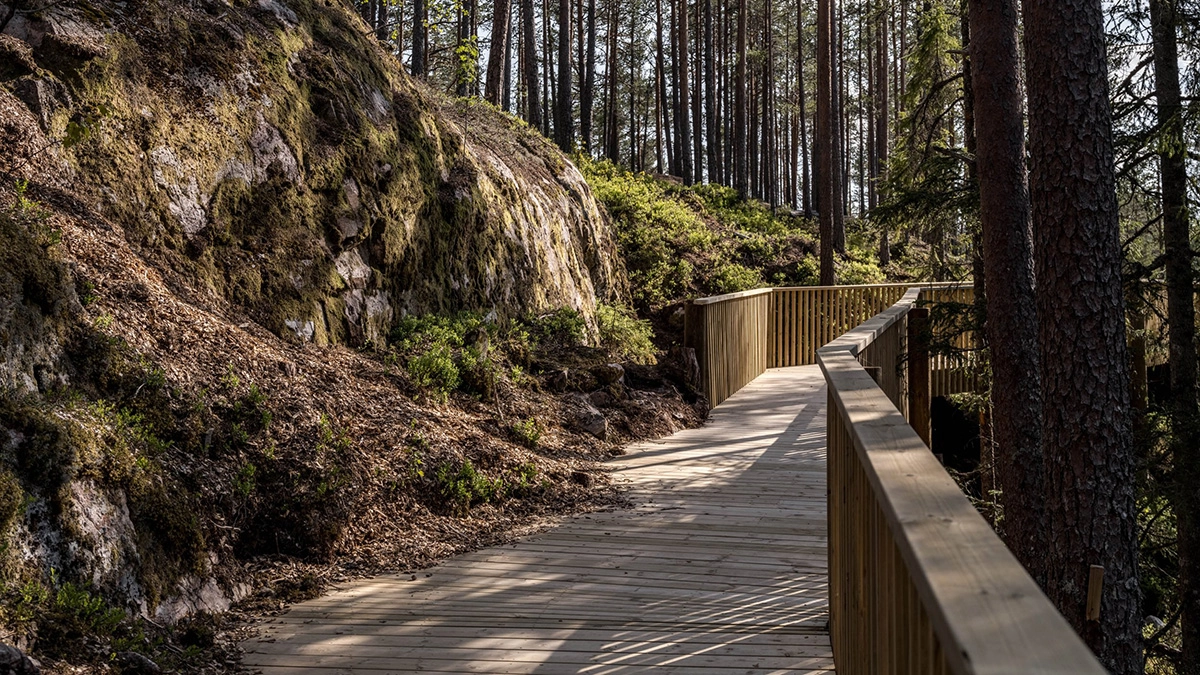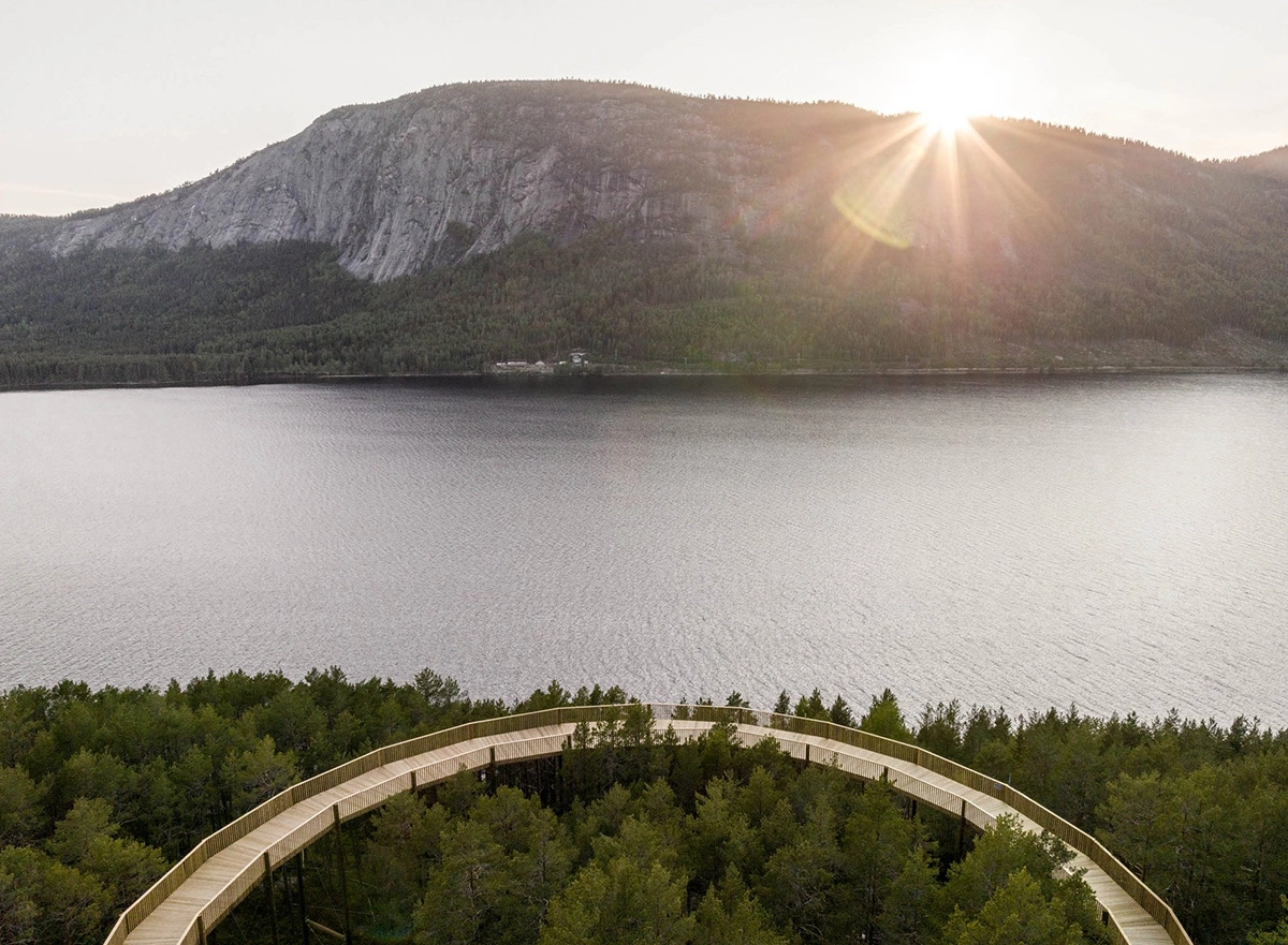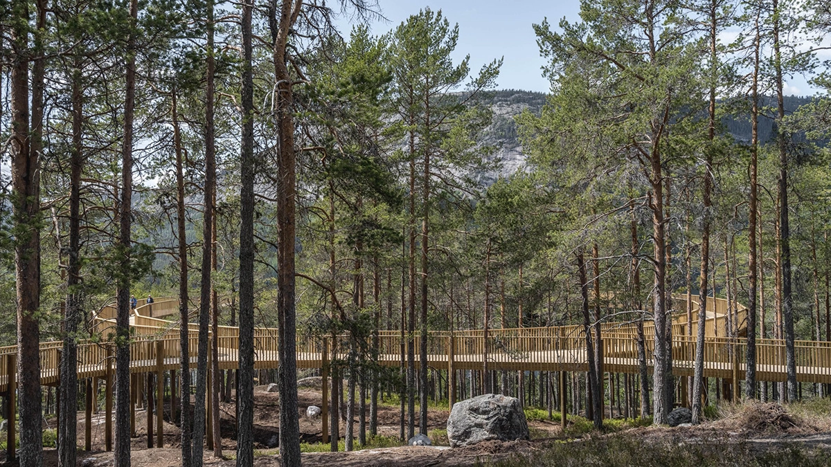 The one kilometer long and two meters wide plank boardwalk extends on pillars all the way from the forest floor, along lake Fyresvatn, up between the treetops, along the mountain ridge and up to the summit of Klokkarhamaren – a hill with an elevation of 338 metres. At the end of the trail, a considerable circular viewpoint with a diameter of 50 meters provides a spectacular 360-degree view over the pine forest, clear lakes and rock formation that make up the natural landscape.