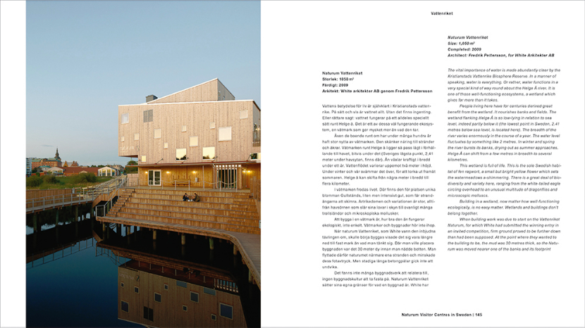 Det har blivit en unik satsning på arkitektur som saknar motstycke i Sverige. Avancerade utställningsbyggnader och det bästa av Sverige i förening. 13 av sammanlagt ett 30-tal naturum presenteras ingående i boken med nära 150 nytagna fotografier av Åke E:son Lindman, ett rikt ritningsmaterial och texter av Claes Caldenby, Mark Isitt och Tomas Lauri.