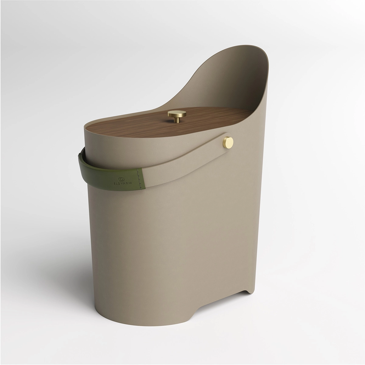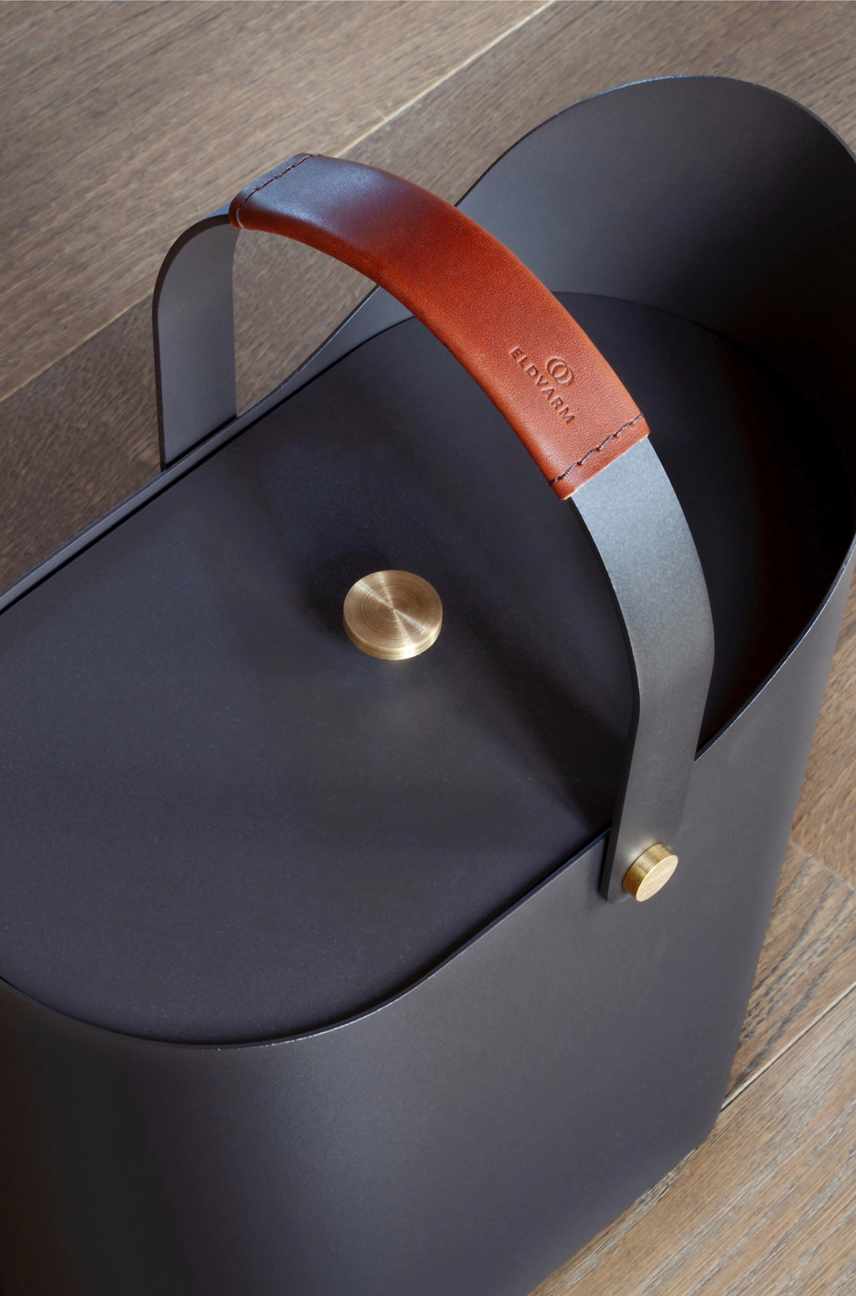 Powder-coated steel provides the foundation, with custom brass details and hand-stitched vegetable tanned leather. Two versions feature oiled walnut lids. Crafted in Poland like all Eldvarm products, each sustainable material speaks to objects built to last.