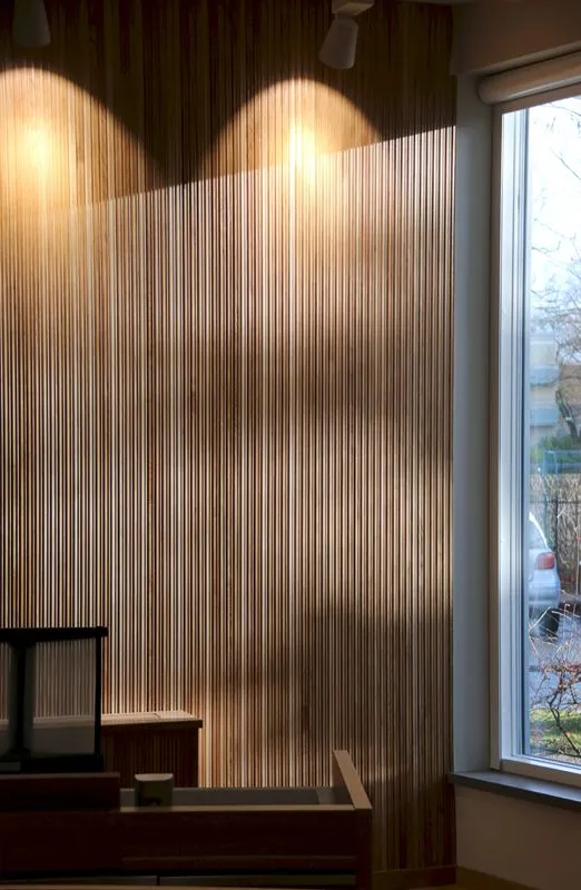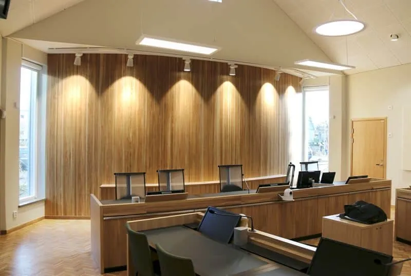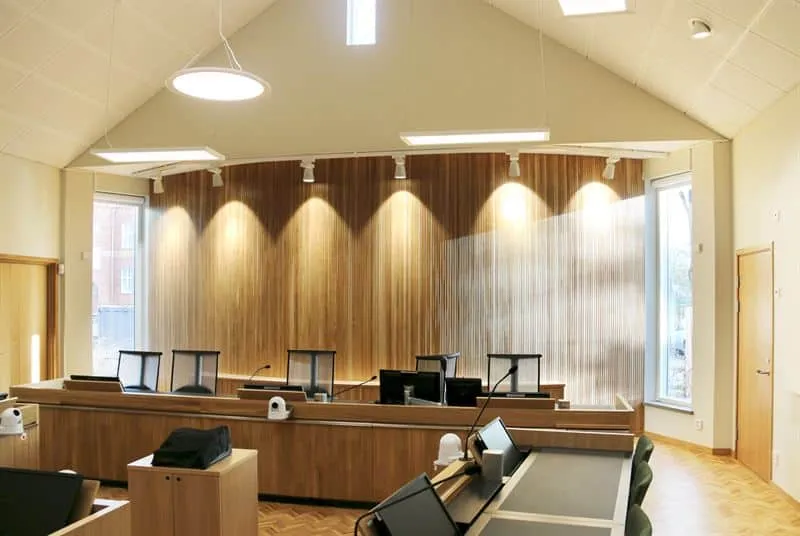 The building is craftsmanship throughout, and all sheet metal is mounted with great care and precision. The cladding consists of zinc sheets of varying widths, placed in a determined “random pattern” from base to ridge. By working with four different widths, there’s never a need to cut the metal. Even the doors are clad in zinc and blend into the pattern. The shape is subdued, and the volumes are located where the courtrooms are, with light intake from above. Tengbom has also designed the interior, including custom-designed tables for the court, parties, and witnesses, as well as loose furnishings.
