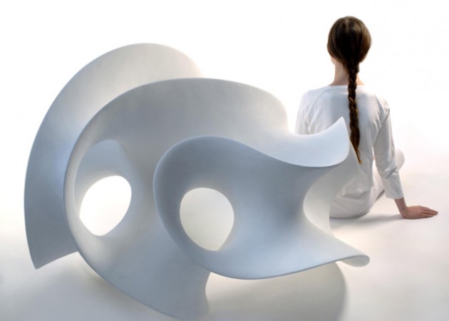 On one hand, it is the mass in thin layers, running in a meander-like closed movement. On the other hand it is the empty space, air and light forming volumes, described by the contours of the mass. The construction is really made of the absent; the emptiness and the holes of air. The obvious body just defines the volume.