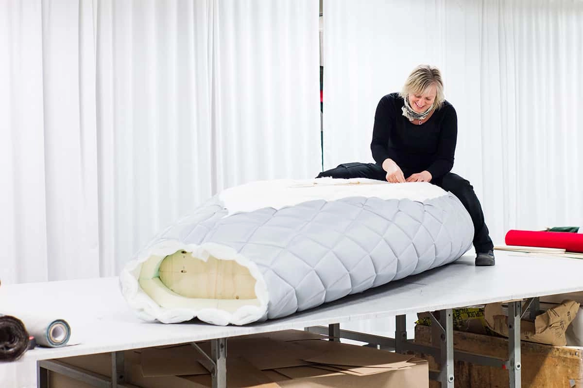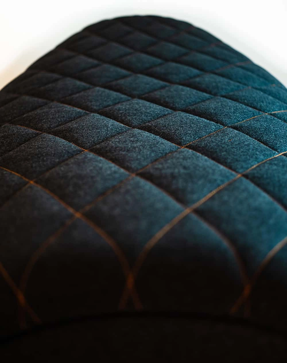 The body of Waka is barely three metres long with a broad centre and narrow ends, which gives it character and space enough for several people to use at the same time. An upholstered surface with a characteristic quilt pattern covers the structure of the furniture. Waka is therefore just as easily arranged in an open landscape in a public environment as it is placed in a lobby or reception area as a beautiful centrepiece.