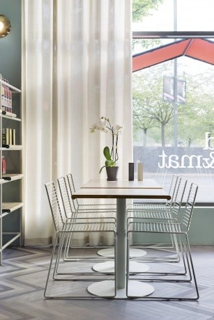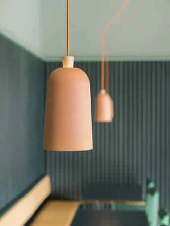 The Finefood restaurant and coffee shop serves well cooked everyday food and pastries for the inhabitants of Hammarby Sjöstad (an exciting new district in Stockholm where the City has imposed tough environmental requirements on buildings, technical installations and the traffic environment, from day one.) in the south of Stockholm.  One of the challenges designing the place is the fact it being a mix of a café, lunch restaurant and bistro. It must work just as well serving breakfast at 7am in the morning as serving beer 7pm in the evening. As a Swedish design studio leaning on our minimalistic heritage, we created a clean, soft space with a calm, inviting color palette. The base of the interior is a custom made herringbone tile floor representing the rich gray scales of rocks and mountains. The color palette – ranging from the deep green marble to various nuances of pale green and turquoise with contrasting salmon red and peach – are a direct translation of the colorful variations of the natural light in the mountains. The materials are typical Scandinavian such as light ash wood, brass and natural leather except for the Green Guatemala marble used some part of the design. Tables, sofas and shelves are specially designed for this project giving it its own unique identity. Over the custom made furnitures we have used – our own ceramic lighting Fuse for Ex-t (IT), lacquered wooden chairs from Zilio Aldo (IT), slick floor tiles from Mutina (IT) and a few reallynice brass wall lights from Atelier Areti (UK) to top things off.