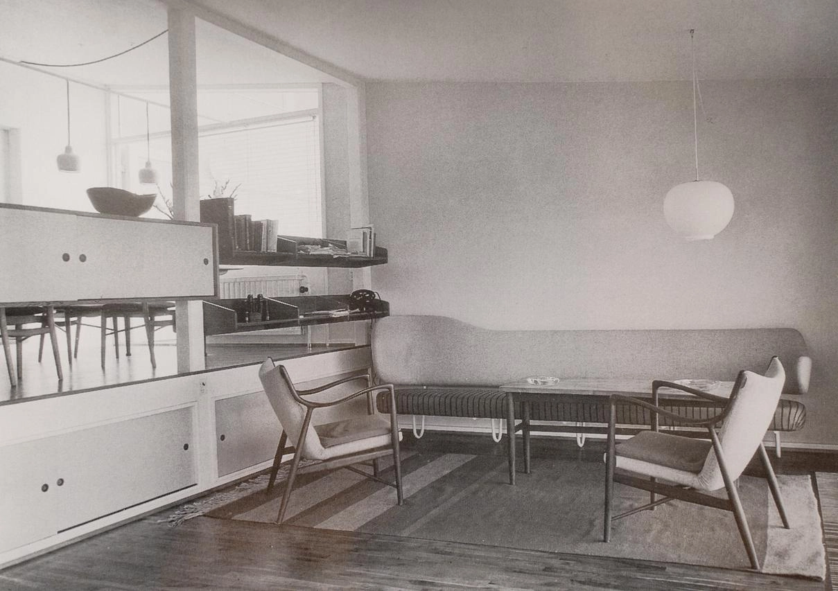 Villa Aubertin was built in 1952 and is located in Nakskov, Denmark. In the living room, the Wall Sofa is displayed alongside two 45 Chairs and custom-designed hanging cabinets facing the dining area. Photo: Aage Strüwing © Jørgen Strüwing