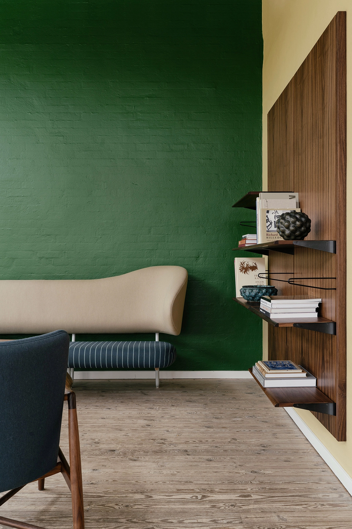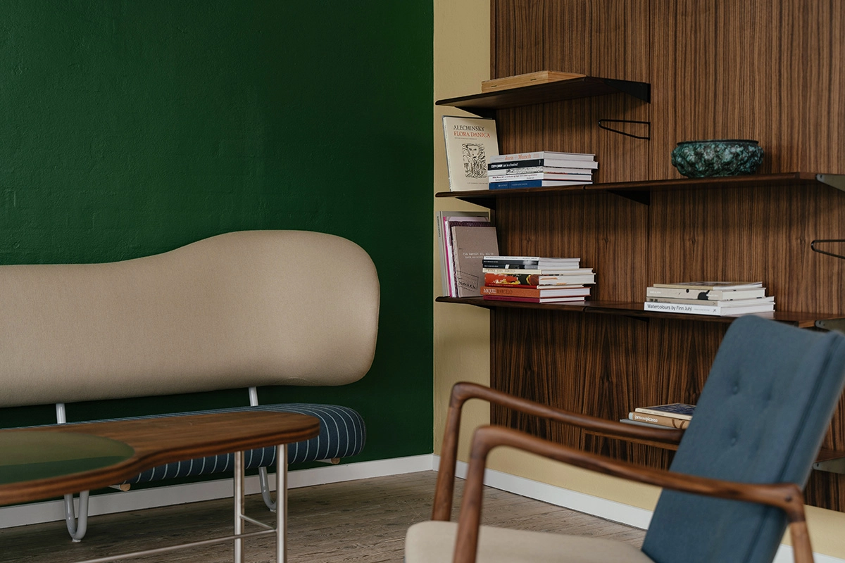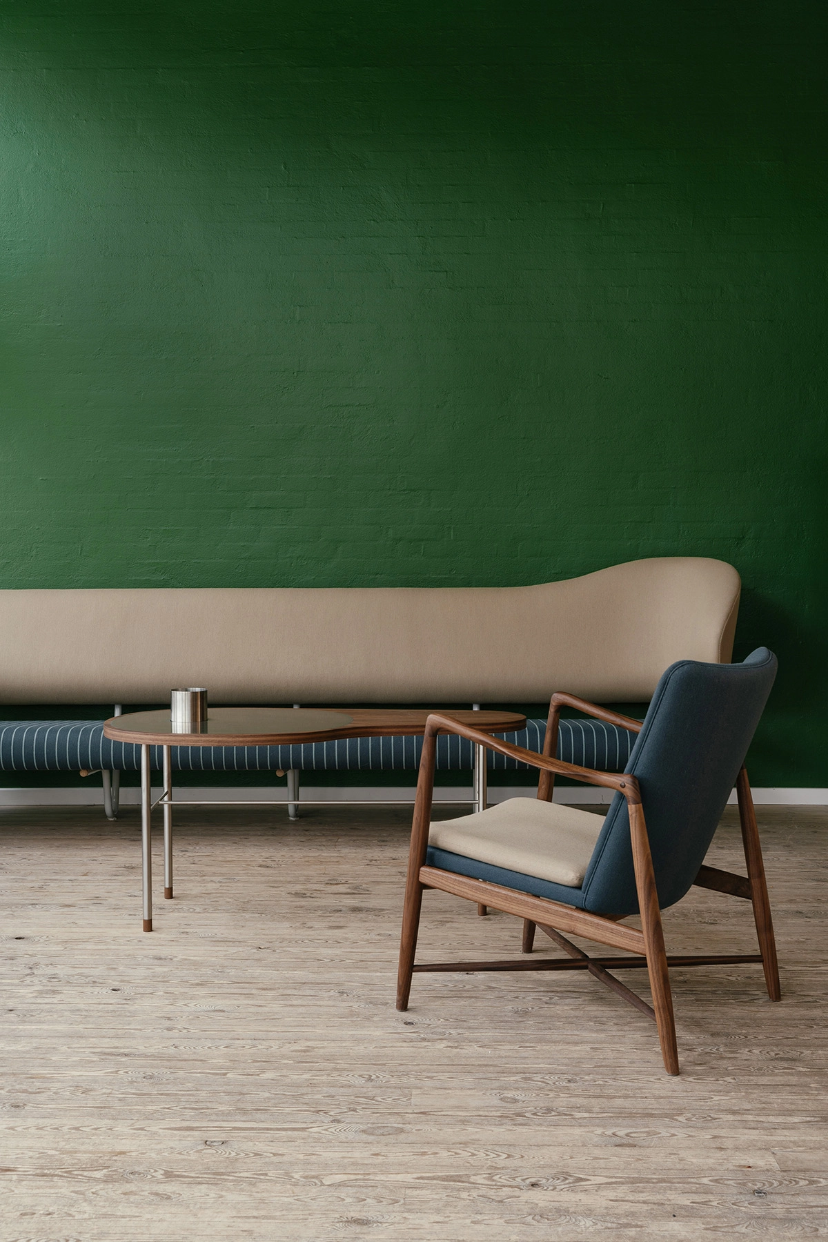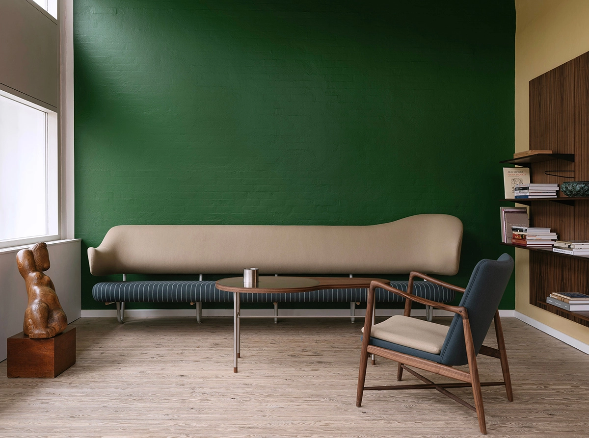 Finn Juhl went on to use the Wall Sofa in several interiors, but the extra-long version of the sofa has never been in continuous production. Today, the Wall Sofa Aubertin is being relaunched at Museum Jorn in a dedicated space that serves as the museum’s interpretation of the room at the National Museum of Decorative Arts and Design in Trondheim—both in terms of color scheme, furnishings, and art.