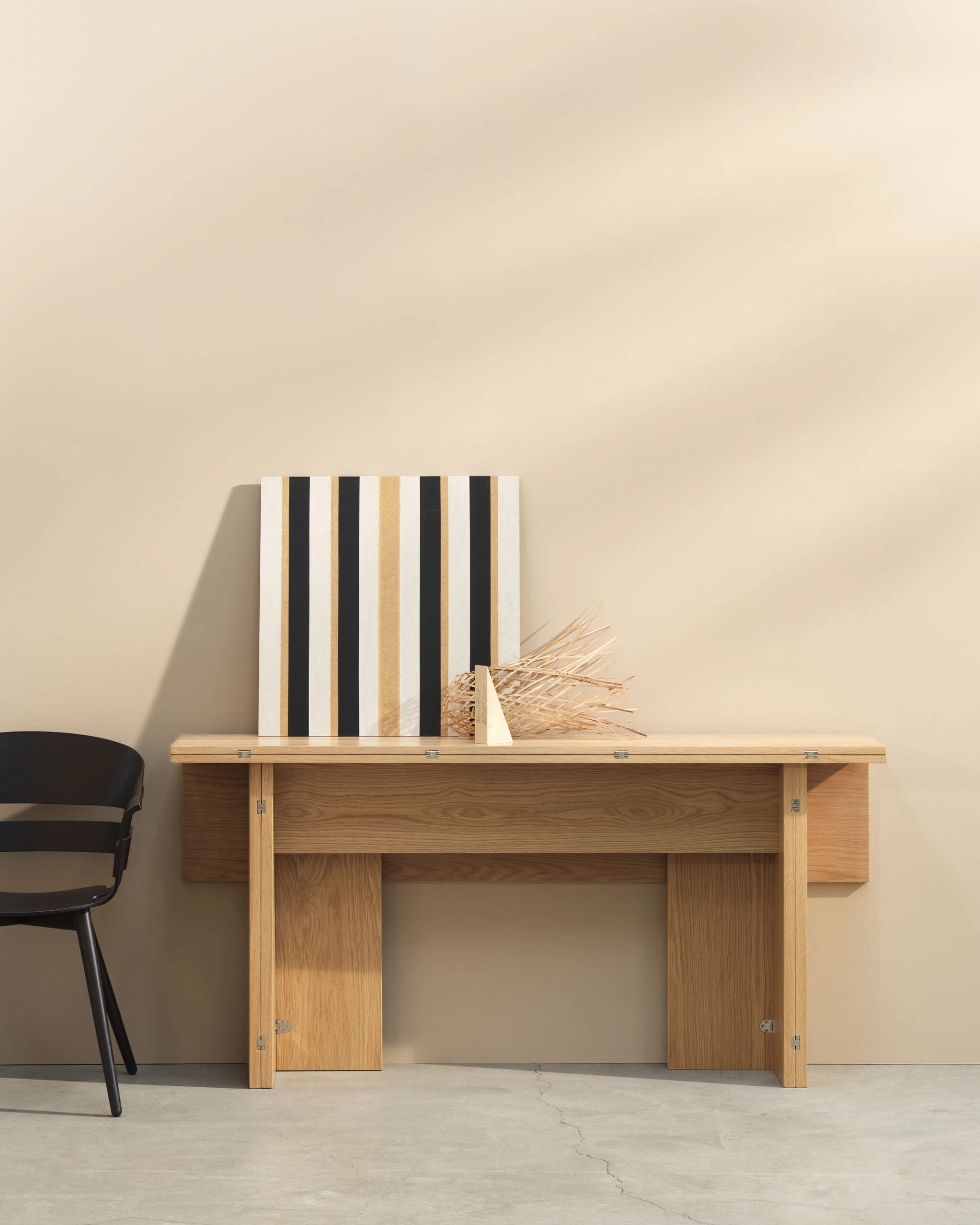 Fold it down to a sculptural sideboard when you need floor space, fold it out to use as a table for work, and clear the space for the longest one when friends or relatives are coming over for lunch or dinner.’
