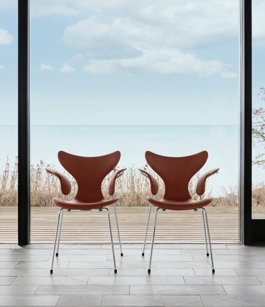 Designed in 1955 and 1968, respectively, the Series 7™ and the Lily™ have earned their place in the Anniversary Collection. The Series 7™ in a front‑upholstered variant in new, exclusive Grace leather with a distinctive chestnut colour and in a front‑upholstered variant with the all‑new Vanir textile designed by Raf Si-mons for Kvadrat. The iconic Lily™ is introduced in a full‑upholstered variant with the same new, exclusive chestnut coloured Grace leather.