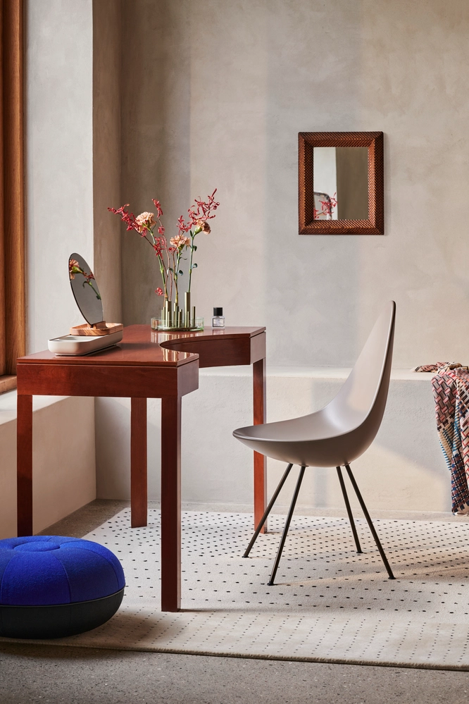 Reintroduced by Fritz Hansen in 2014 using modern production methods and techniques, the characteristic chair is now refreshed once more in a palette of sophisticated muted hues and powdercoated base finishes. Reimagining its iconic form, harmonious shades of clay, beige, green and rose honour the original design. Together with new powder-coated base finishes on the chair’s slender metal legs, the expression is one of understated elegance. The Drop is equally at home in a dining room as a home office or hall, grouped together or as a standalone statement.